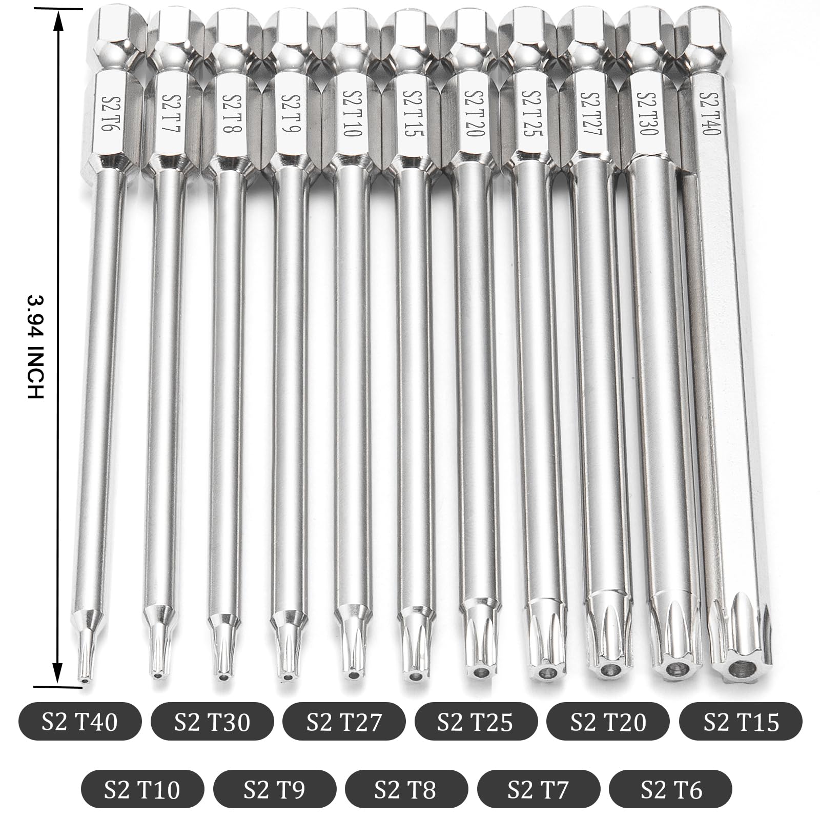 11 Piece Security Torx Bit Set (T6-T40), 1/4 Inch Hex Shank S2 Steel Magnetic Tamper Proof star screwdriver bit set 4" Long