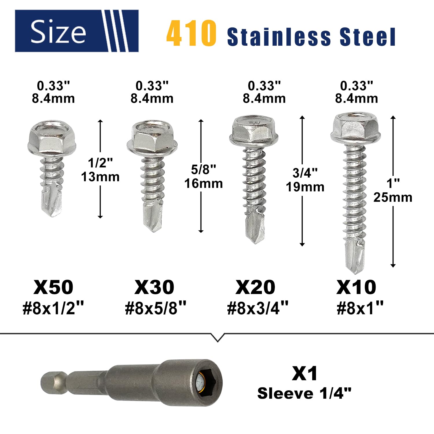 - 【Multi-Size Assortment Kit】 Includes 110PCS of #8 self-tapping metal screws in a variety of sizes: 50pcs of 8x1/2", 30pcs of 8x5/8", 20pcs of 8x3/4", and 10pcs of 8x1" to meet all your fastening needs.