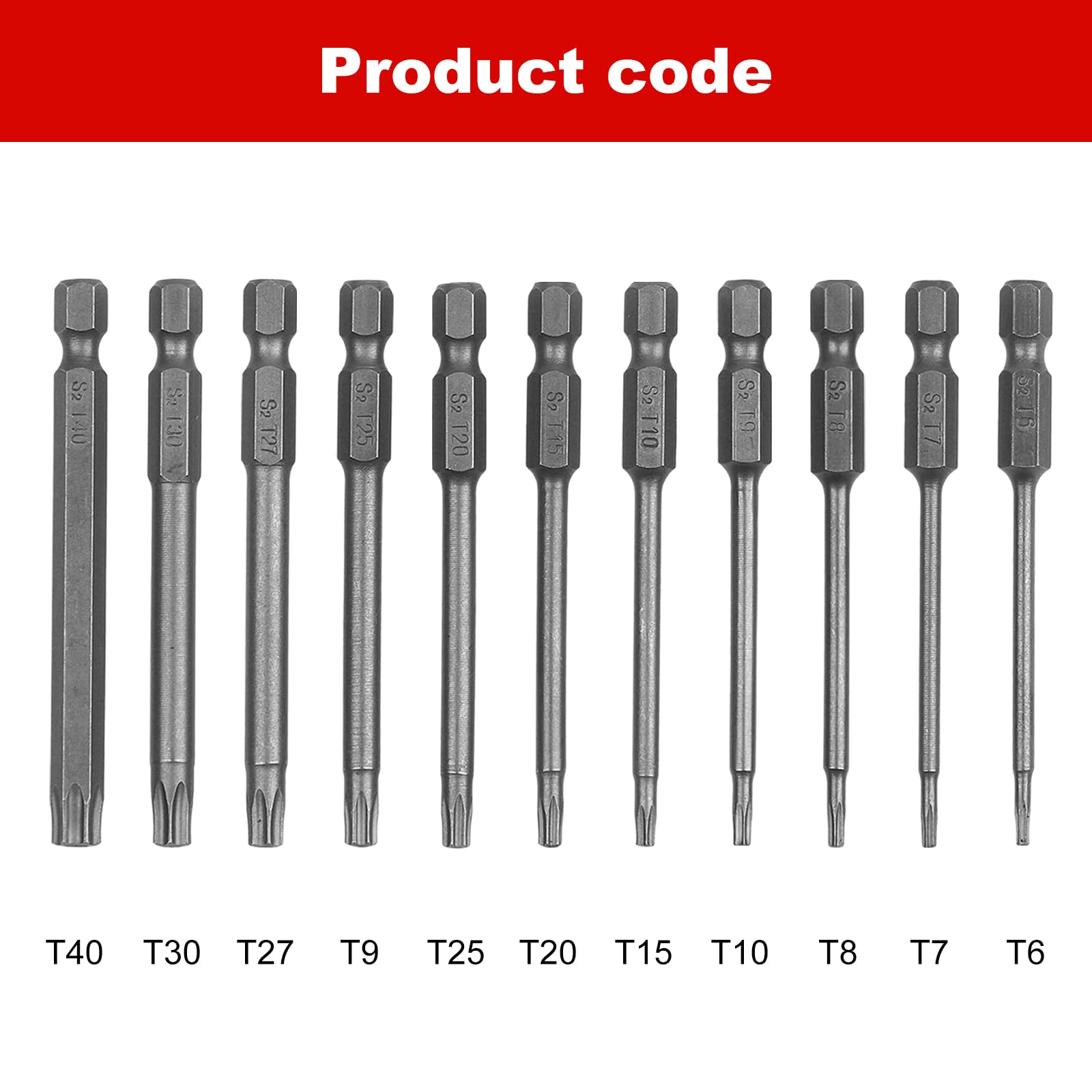 11PCS 75mm S2 Steel Torx Head Screwdriver Security Torx Bit Drill Set 1/4 Inch Hex Shank T6 T7 T8 T9 T10 T15 T20 T25 T27 T30 T40 3 Inch Length