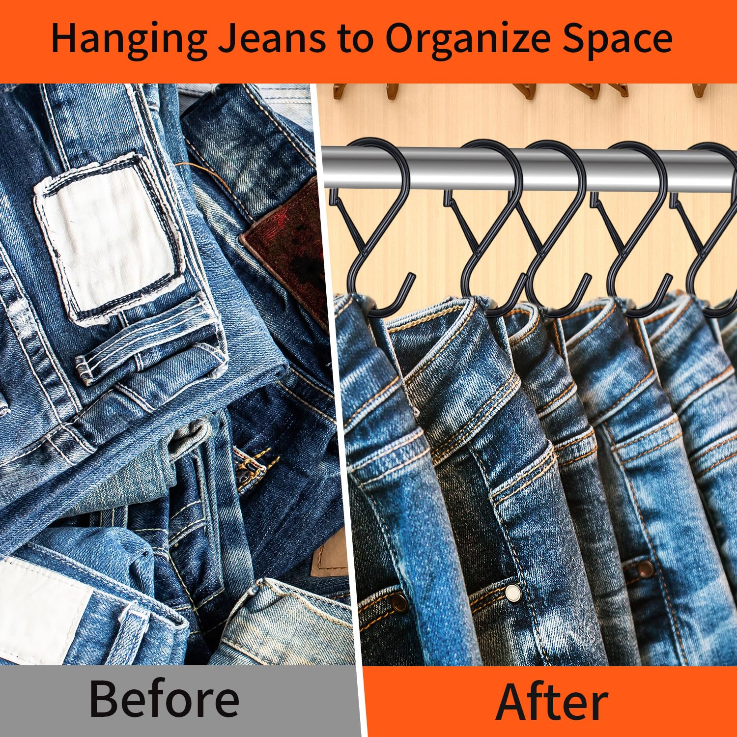 - Designed S hooks with Safety Buckle: Fit most of Rod which diameter is under 1 inches. No more worry about slip off the rod among using. These industrial-grade S hooks are designed to hold heavy-duty items like jeans, coats, pots, and outdoor plants. The reinforced metal construction and anti-rust coating ensure long-lasting strength, supporting up to 30 lbs. Perfect for organizing closets, garages, kitchens, or outdoor spaces, these hooks resists bending and dropping.