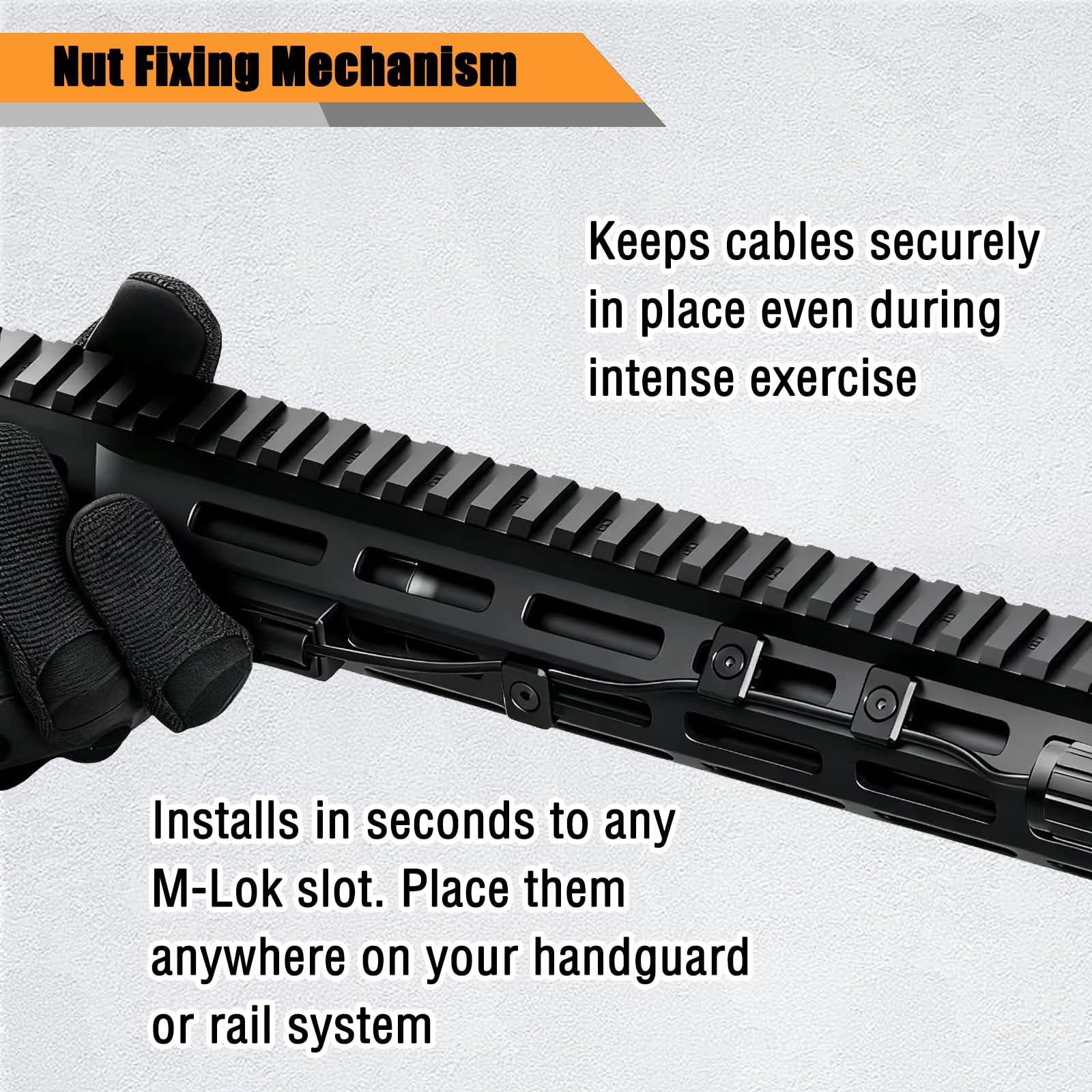 - Installs in seconds onto any M-Lok slot. Position them anywhere along your handguard, or rail system to create a custom wire routing solution for your specific setup.