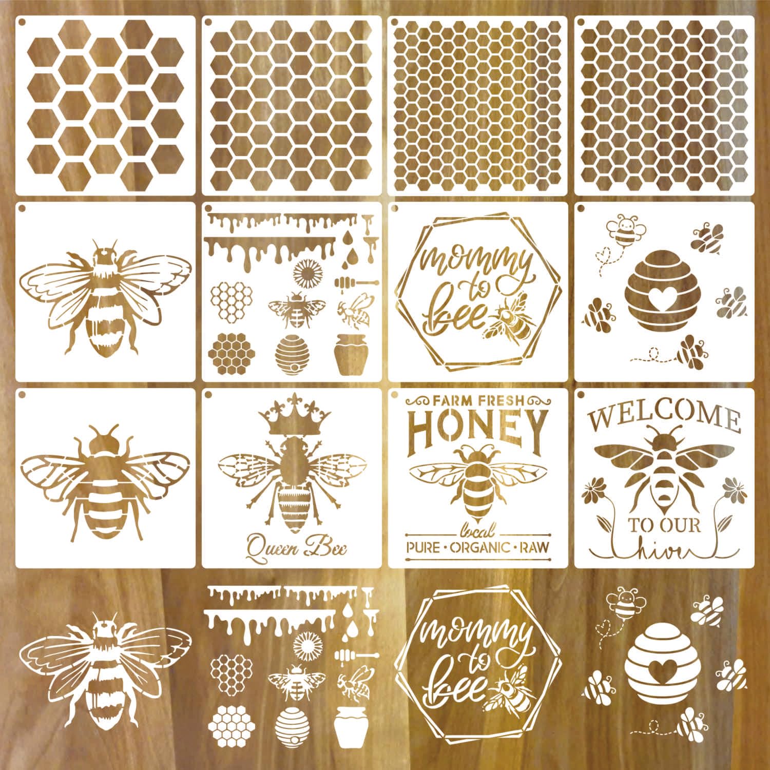 - Bee Stencils Details: Our painting stencils are designed with various of large small bees, hexagon honeycomb, honey pattern and more, cute and vintage. They can be freely combined and colored, great to stimulate creativity and imagination.