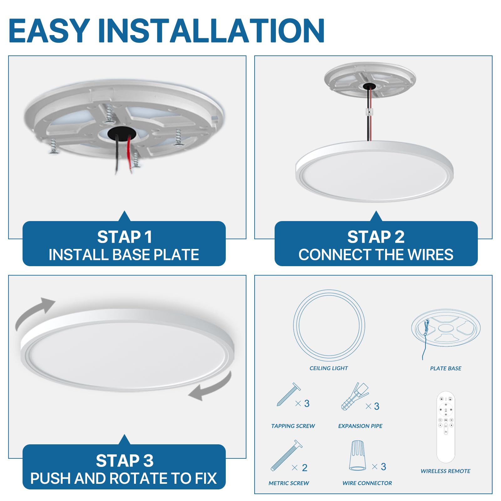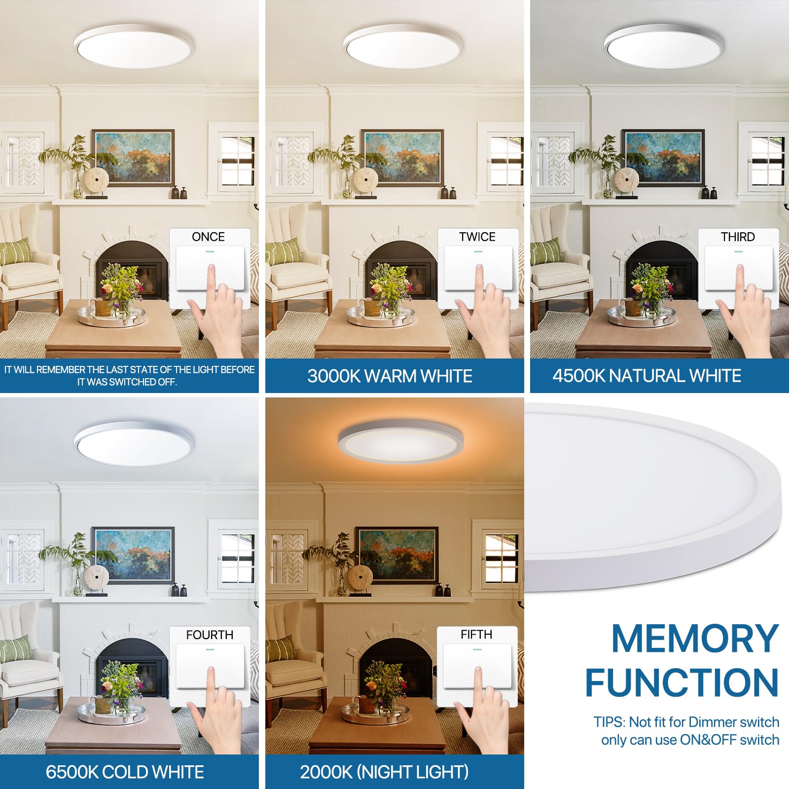 - MEMORY FUNCTION & 4 REMOTES – This ultra-thin LED ceiling light features memory recall for your last setting. Includes 4 remote controls for effortless adjustments. Switch between modes: 1st (memory), 2nd (3000K), 3rd (4500K), 4th (6500K), and 5th (2000K). Remotes need 2 AAA batteries each (not included).