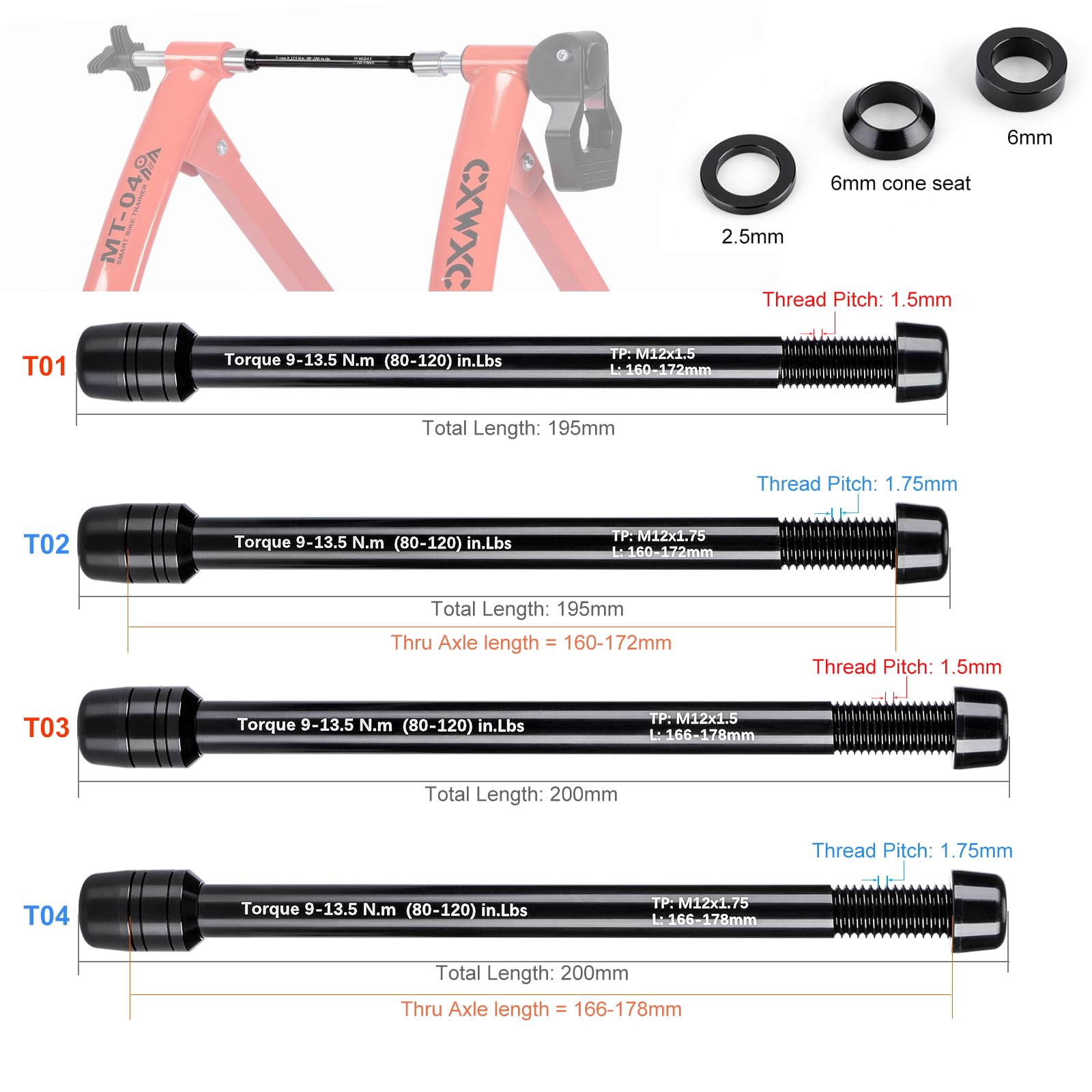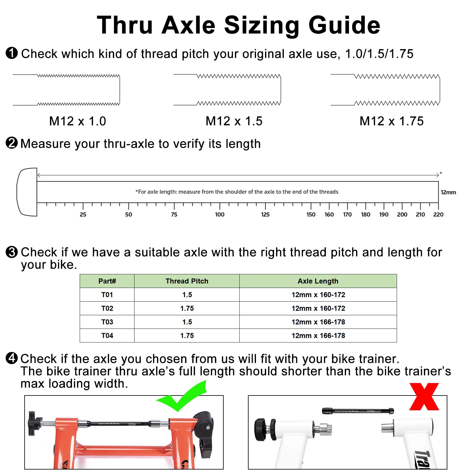 - 【Choose the Right Size】: Thread Pitch: M12 x P1.5. Length 160mm to 172mm; Thread Pitch: M12 x P1.5. Length 166mm to 178mm; Thread Pitch: M12 x P1.75. Length 160mm to 172mm; Thread Pitch: M12 x P1.75. Length 166mm to 178mm. Check the thread pitch of your current axle by comparing it to the pitch size difference illustration on this listing, choose the specific Traxle you’ll need to fit your bike.