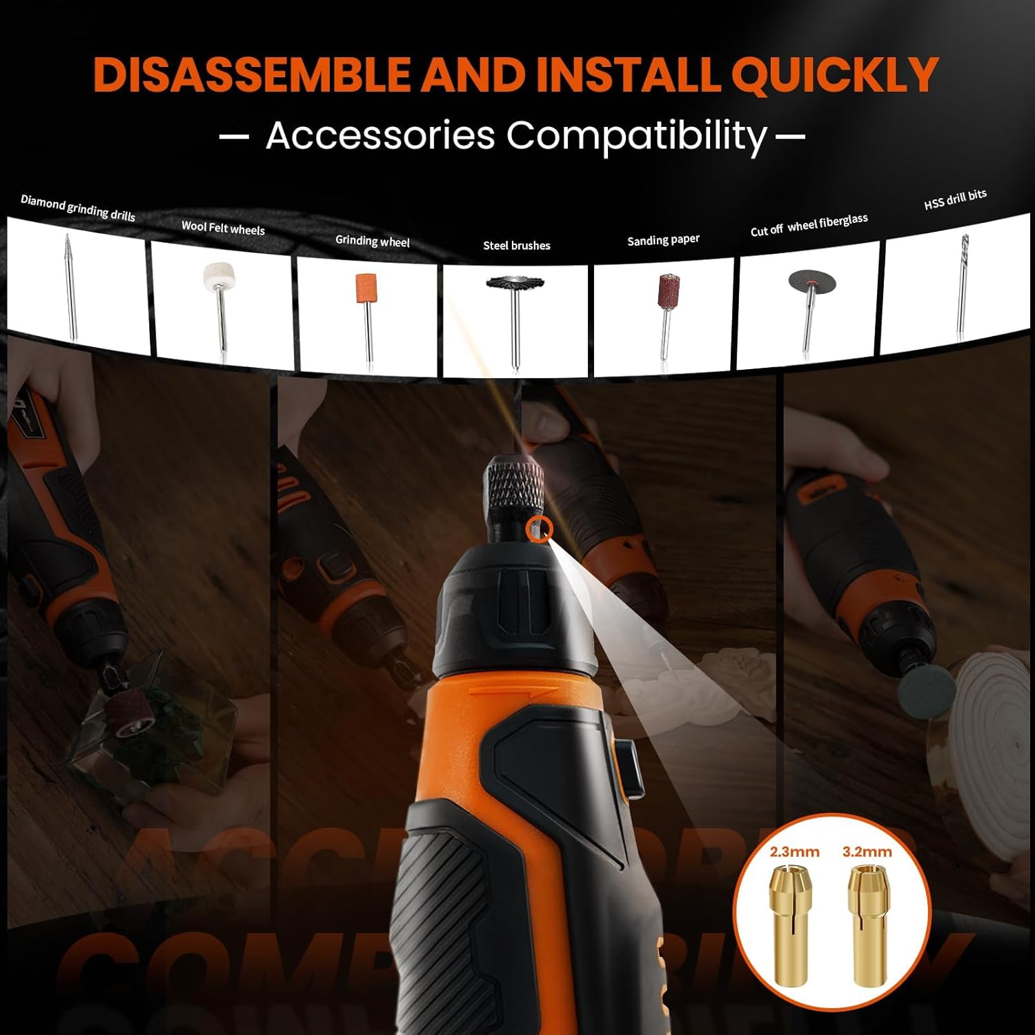 - 【HIGH PERFORMANCE AND HOME ESSENTIALS】- The rotary tools are small yet powerful handheld devices, Two collet sizes accept a wide range of bits and attachments, perfect for various household tasks, ranging from repairs and maintenance to crafting, hobbies, and even pet care.