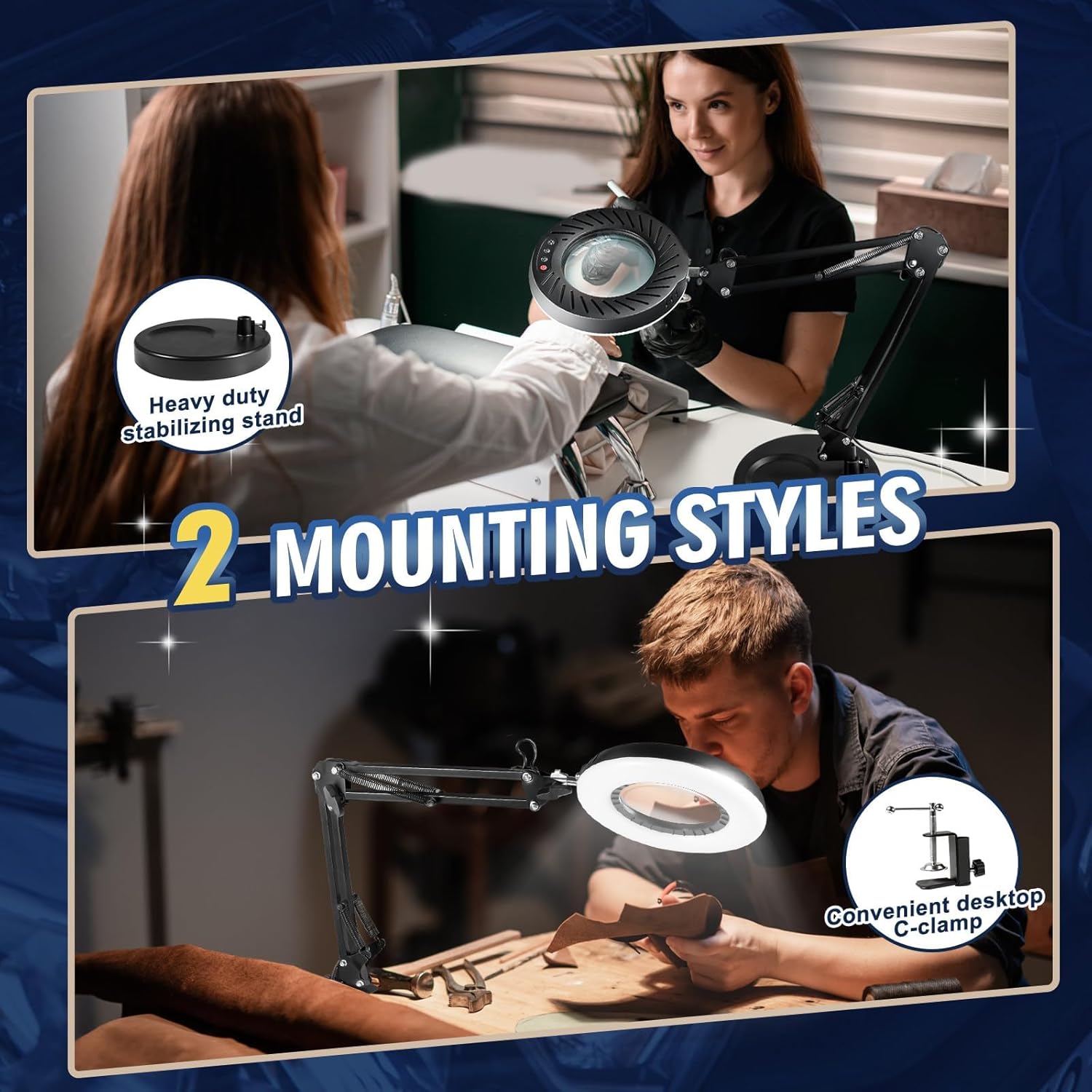 - 【5 Color Modes & 10-Level Brightness】This magnifying lamp features adjustable color temps and brightness, ideal for low vision needs. The desktop magnifying glass with light has convenient head-mounted controls - no bending needed. Perfect for reading and detail work, this lighted magnifying glass with stand delivers comfortable, glare-free illumination.