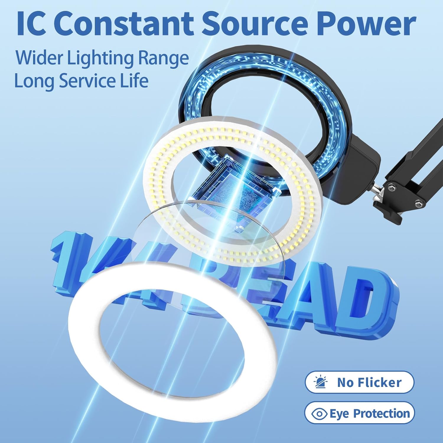 - 【Memory Function Magnifying Desk Lamp】Our magnifying glass with light hands free features a memory function to restore the last used mode without readjustment. Additionally, the lamp head remains cool even after extended use, preventing overheating and ensuring safety and comfort.