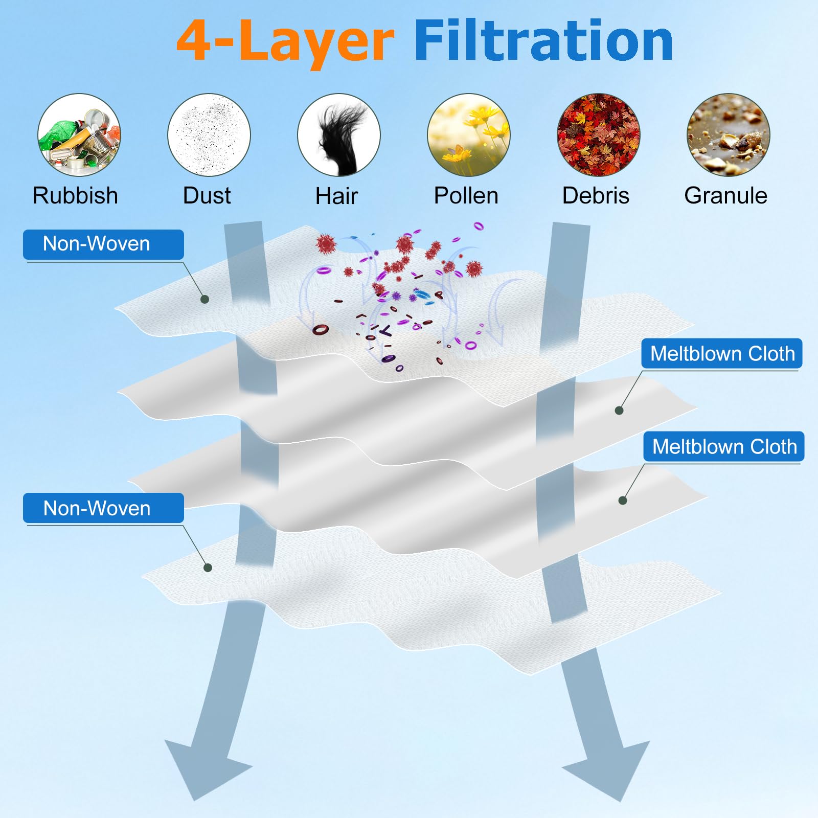 - 【HIGH-EFFICIENCY PERFORMANCE】- Efficient Performance]- Made of melt-blown fiber filter layer and non-woven fabric. Superb craftsmanship and quality materials can effectively block 99.9% of dust and fine dust particles.