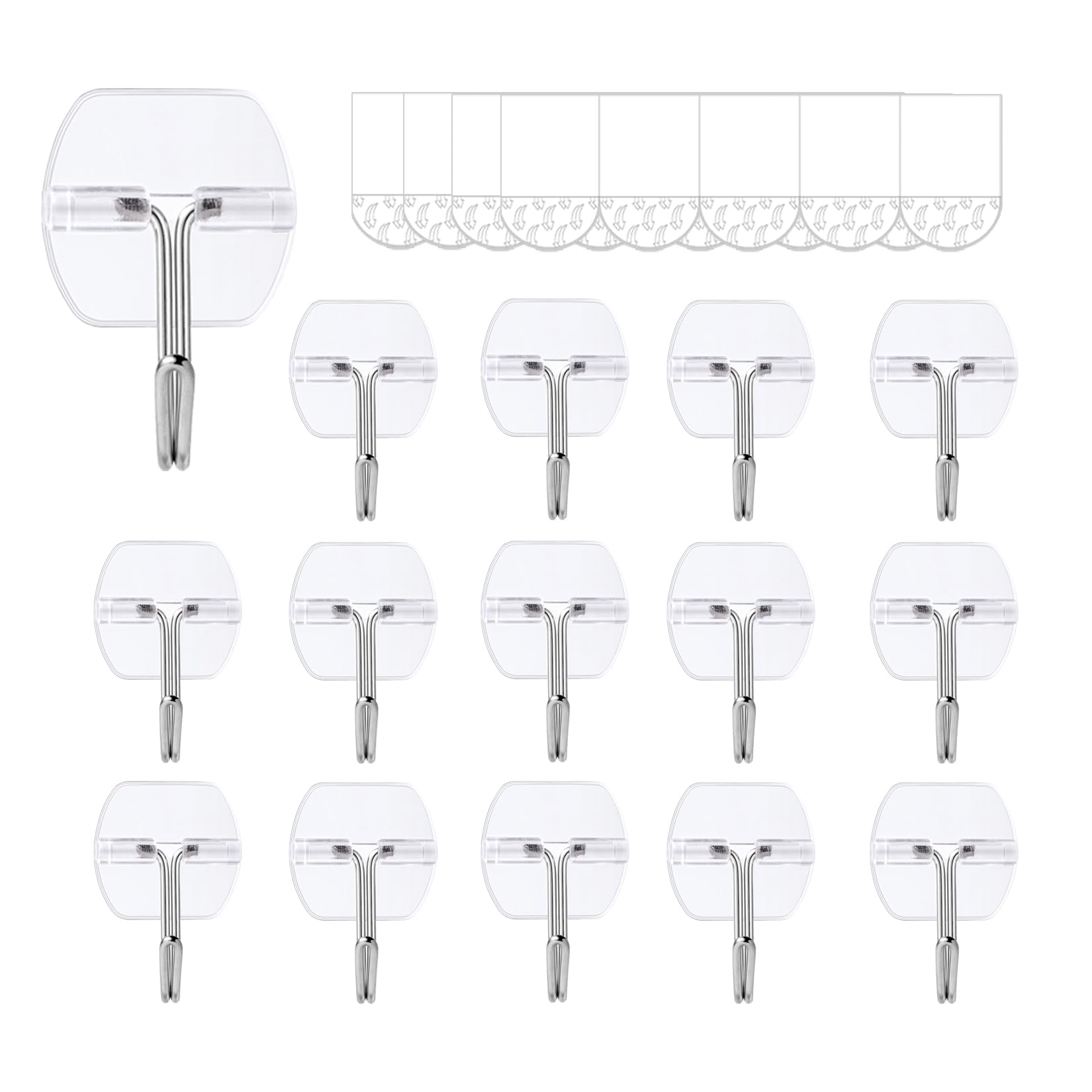 - 【WHAT YOU GET】: One package of the Clear Small Wall Hooks includes 15 clear wall hooks and 20 adhesive strips; each adhesive wall hook can hold up to 0.5 pounds