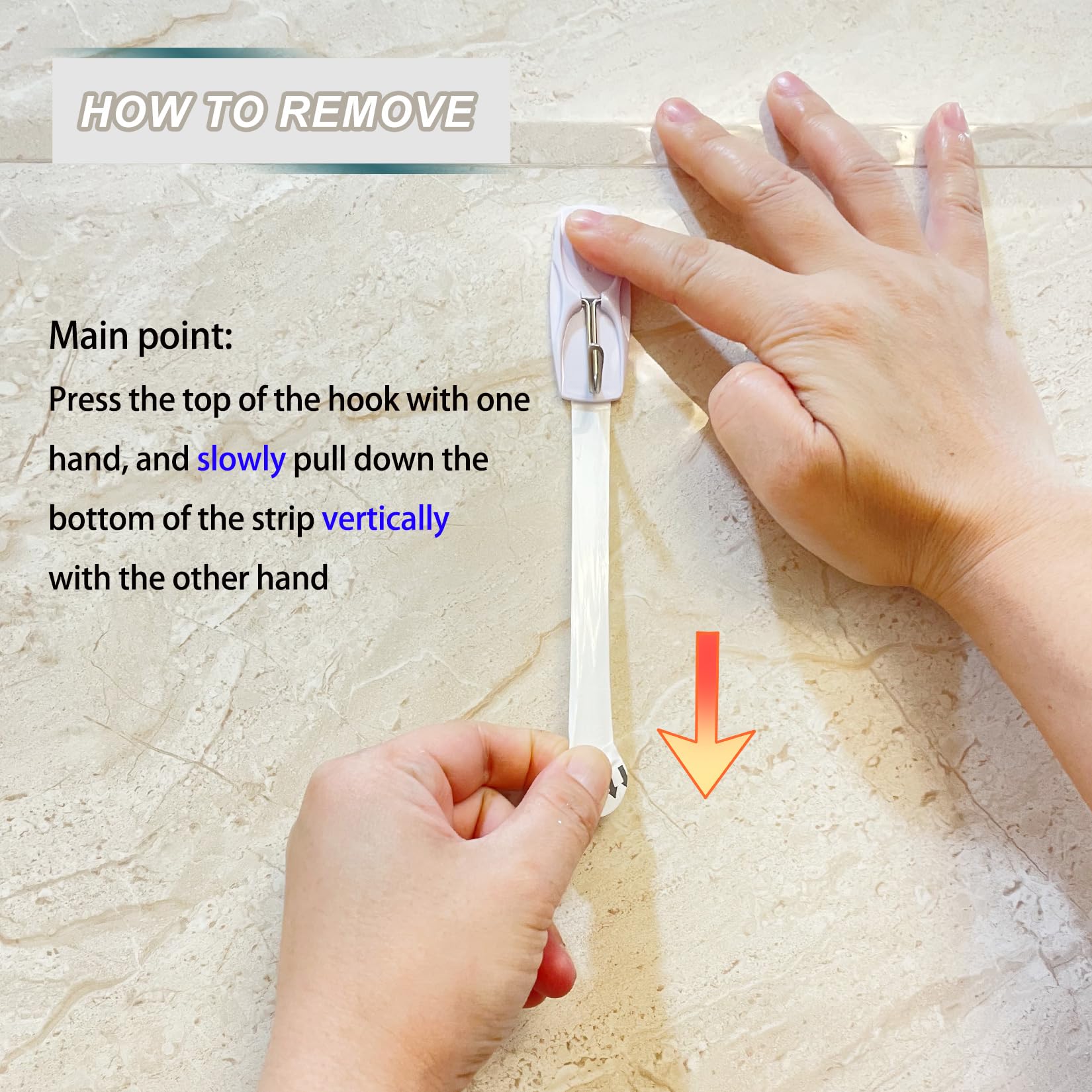 - 【REMOVABLE WALL HOOKS】Lightly hold the top of the wall adhesive strips and slowly pull straight down towards the floor to remove the hanging hooks and prevent damage to walls and surfaces.