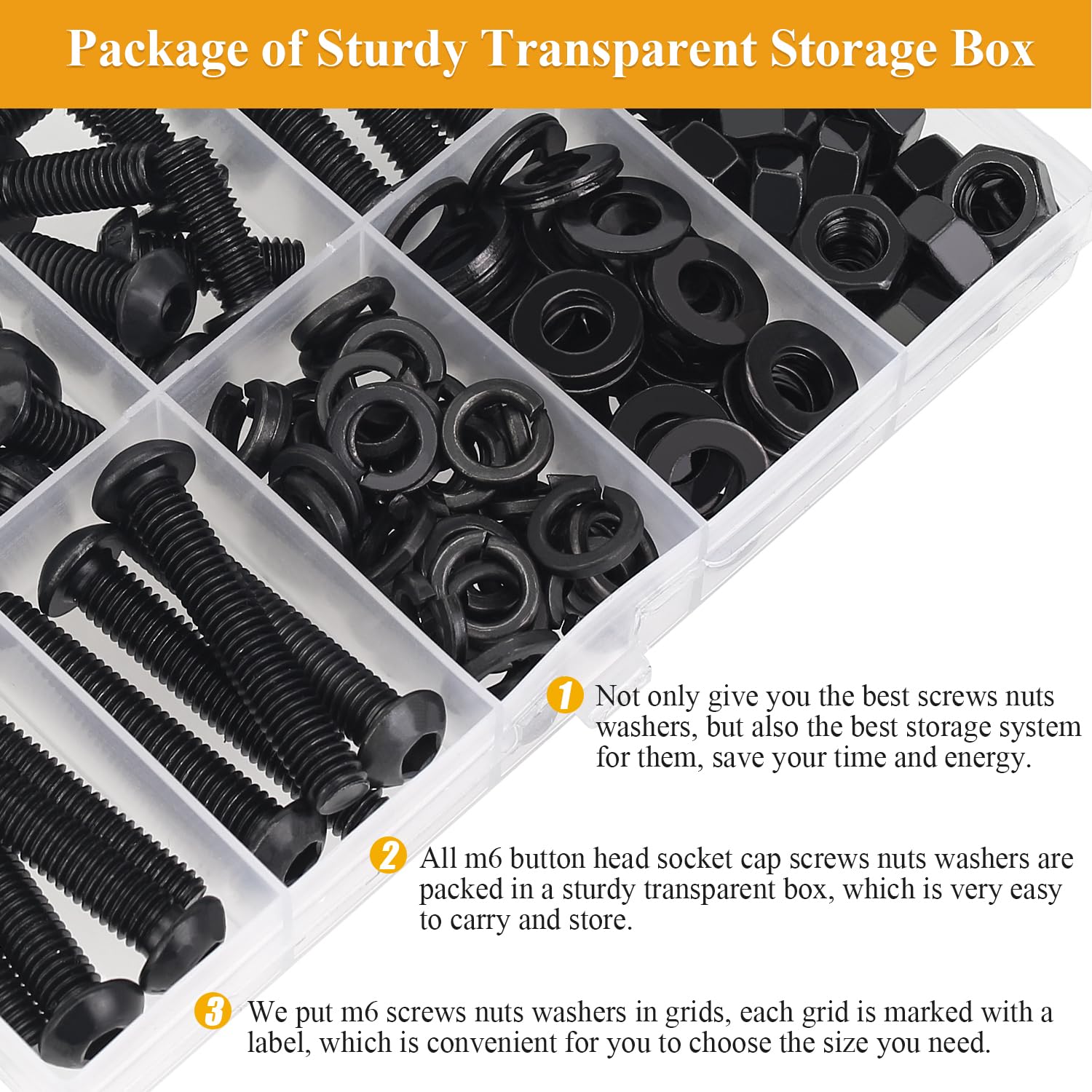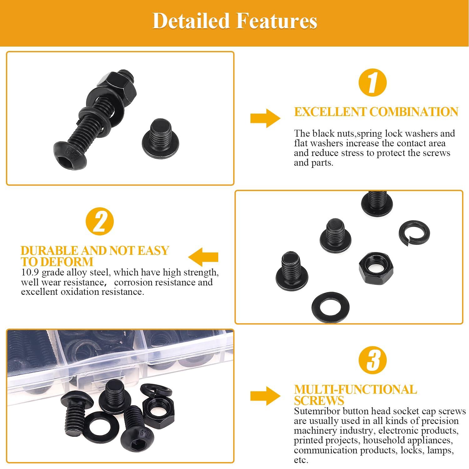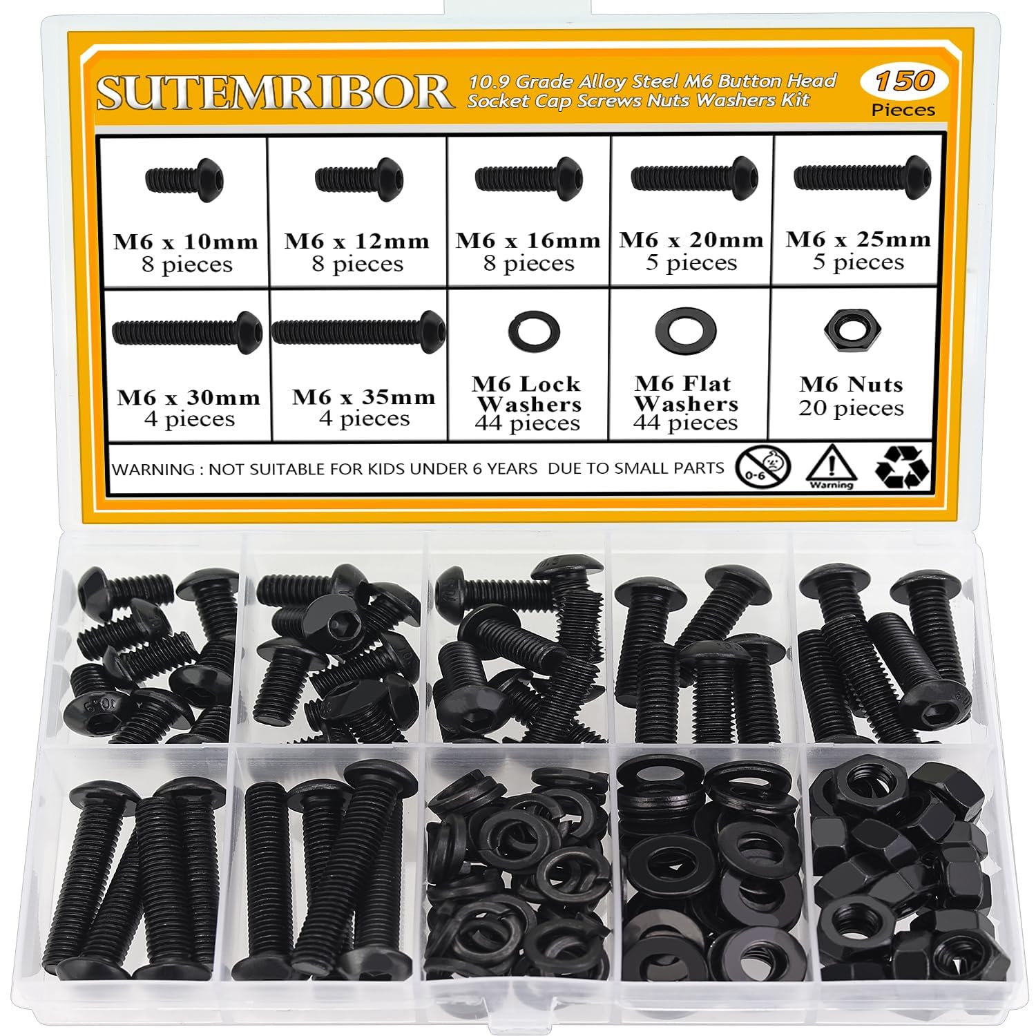 - √ Package Included: 150 pieces Sutemribor M6 x 10/12/16/20/25/30/35mm black button head socket cap screws nuts washers are packaged in a clear plastic box, we put screws nuts washers in 10 grids, each size is marked with a clear label, which is very convenient for you to carry and use. If you have any questions, please free to contact with us and we will reply to you as soon as possible.