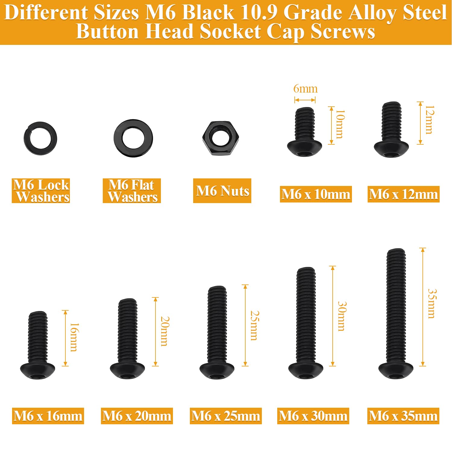 - √ Dimension: Total 150 pieces M6 x 10/12/16/20/25/30/35mm black button head socket cap screws with matching nuts, lock washers and flat washers, different sizes and enough quantities can meet your different daily needs.