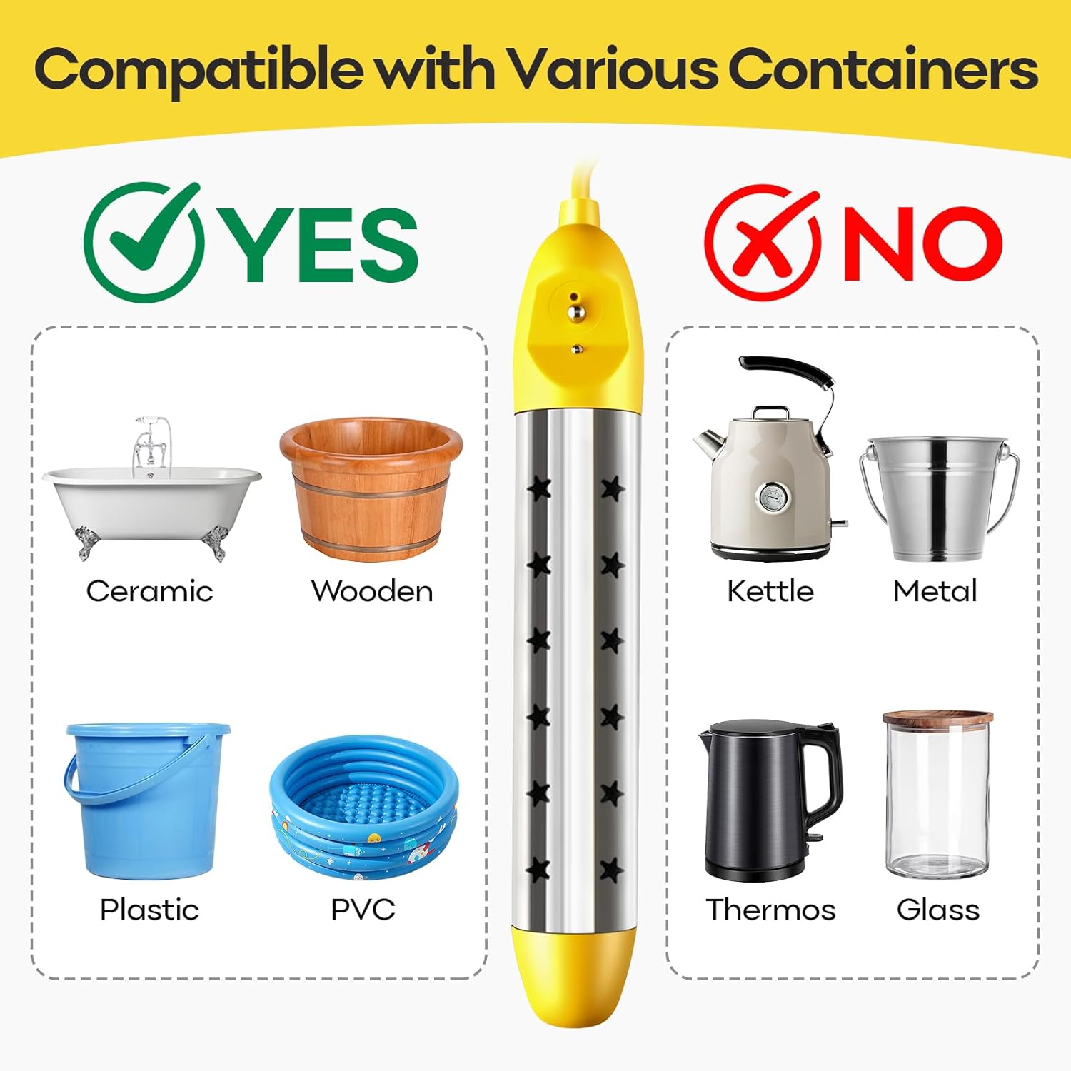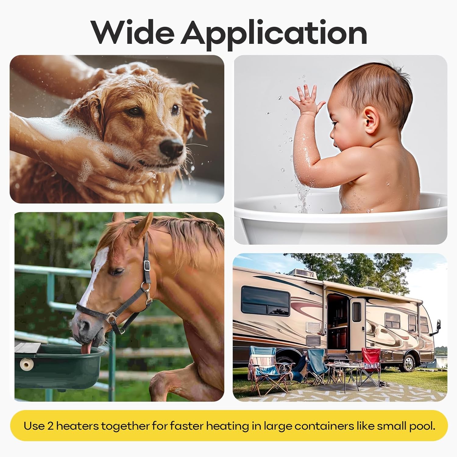 - Reminder: Do not use it in metal/glass containers; Fully submerge heater before plugging in; Do not use 2 heaters on the same outlet; Do not touch water while heater is power on; Use 2 heaters together for faster heating in large containers like small pool, plug them into separate outlets for safety