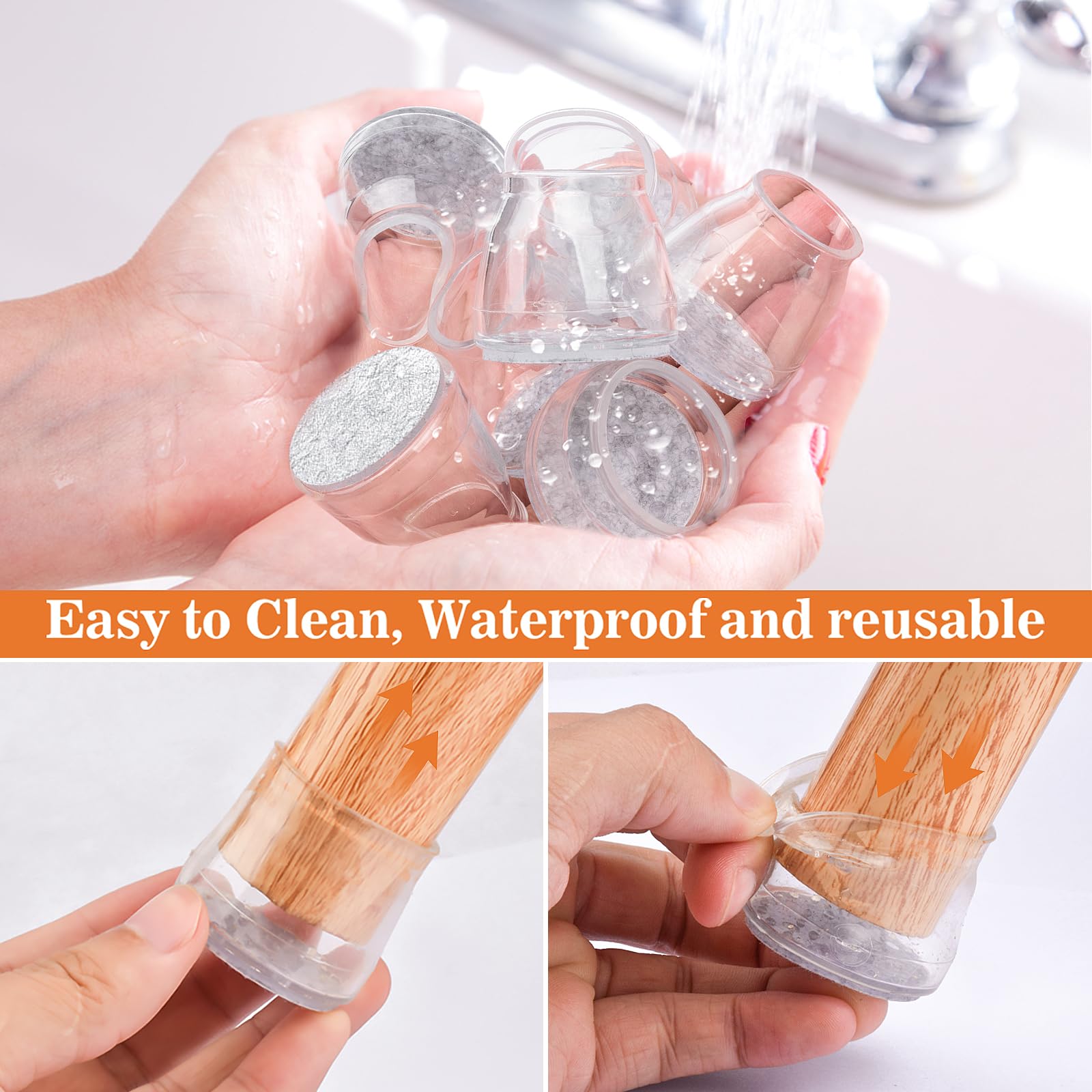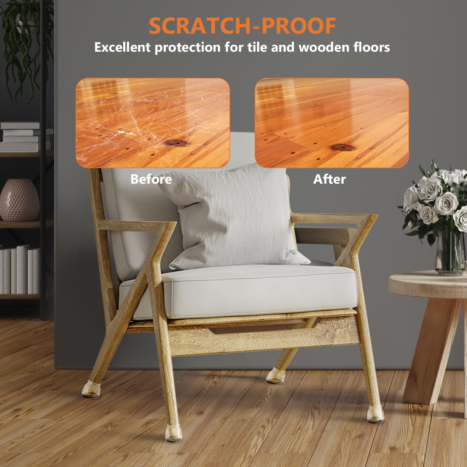 - [Transparency & Universal Fit]: This is an invisible chair leg protectors for hardwood floors, which is made of transparent silicone material, which greatly restores the original color of the table and chair legs and looks more natural. Our silicon chair leg floor protectors are very elastic and stretchable. Can be used for chairs, sofas, cabinets, beds with square legs.