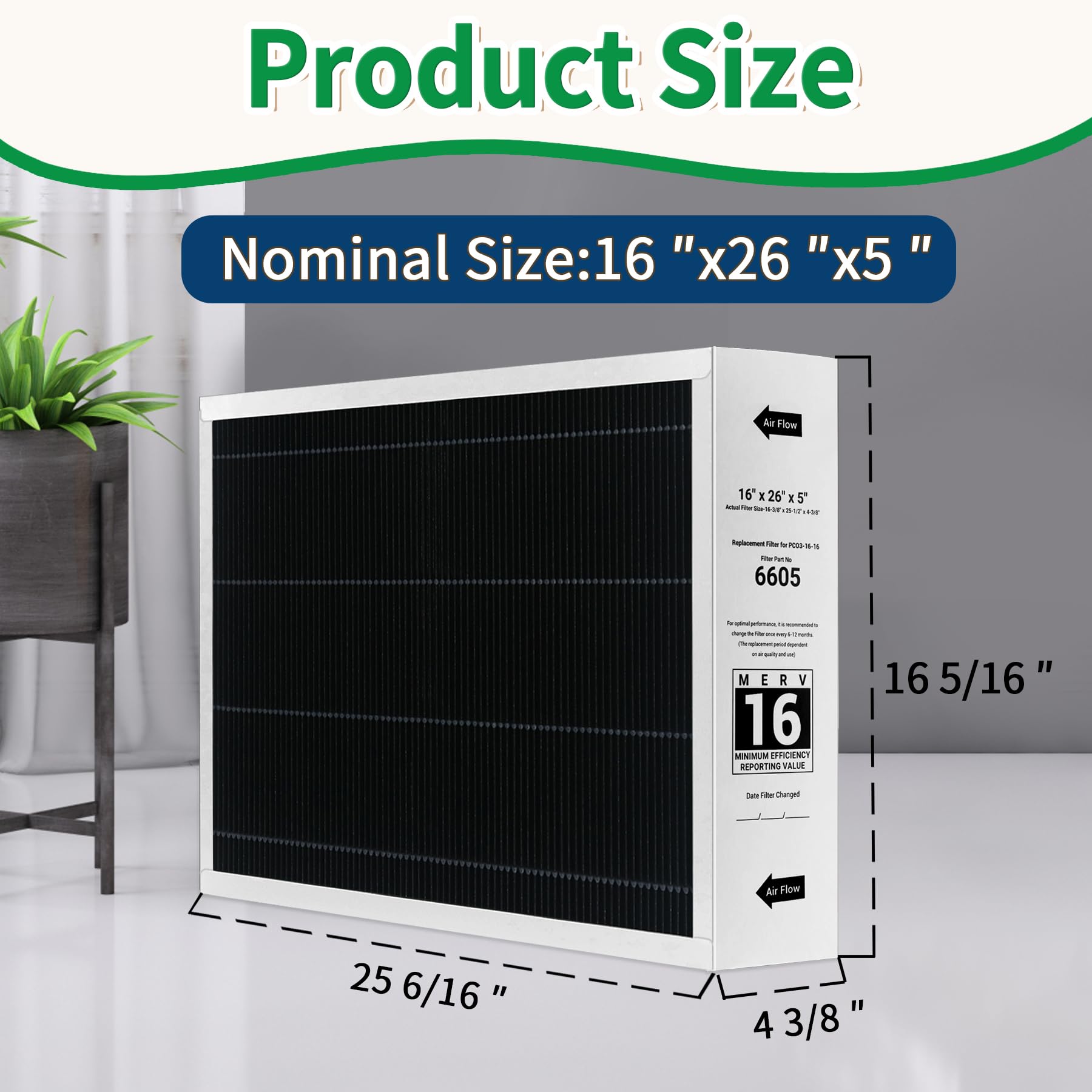 - 【Built to Last】The 16x26x5 air filter MERV 16 kit lasts up to one year, with replacement frequency depending on your environment. For optimal filtration, we recommend replacing the filter every 6 to 12 months