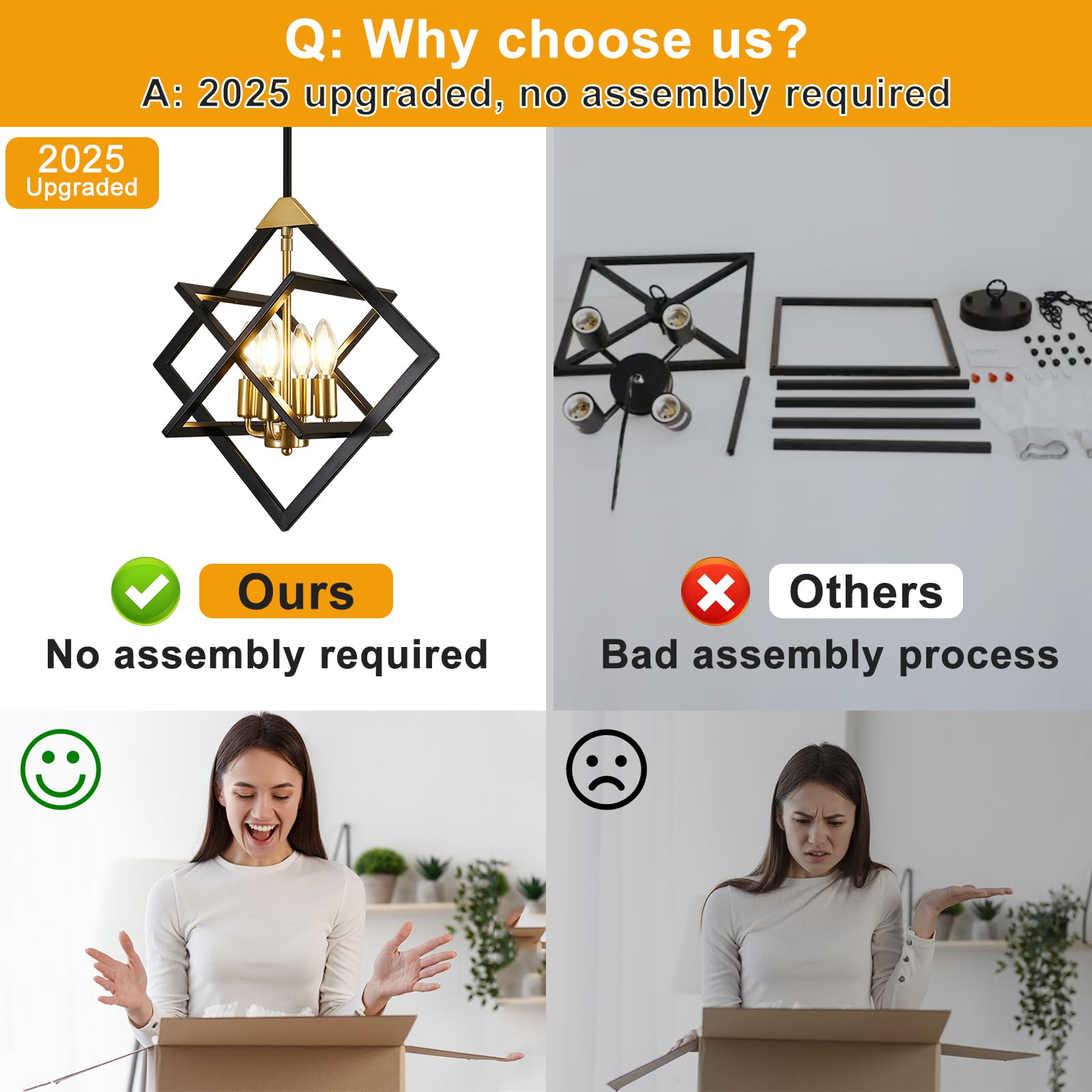 - No Assembly Required & Height Adjustable Black and Gold Chandelier - This dining room light fixture Dia 18 in, lamp body height 17.5 in. The maximum length of the boom is 60.4in/153cm. This 4-light entryway chandelier's boom consists of multiple removable hanging rods, allowing you to easily adjust the length. Easy installation with plenty of fun, it's a great choice for you to finish this do-it-yourself project with your family and friend.