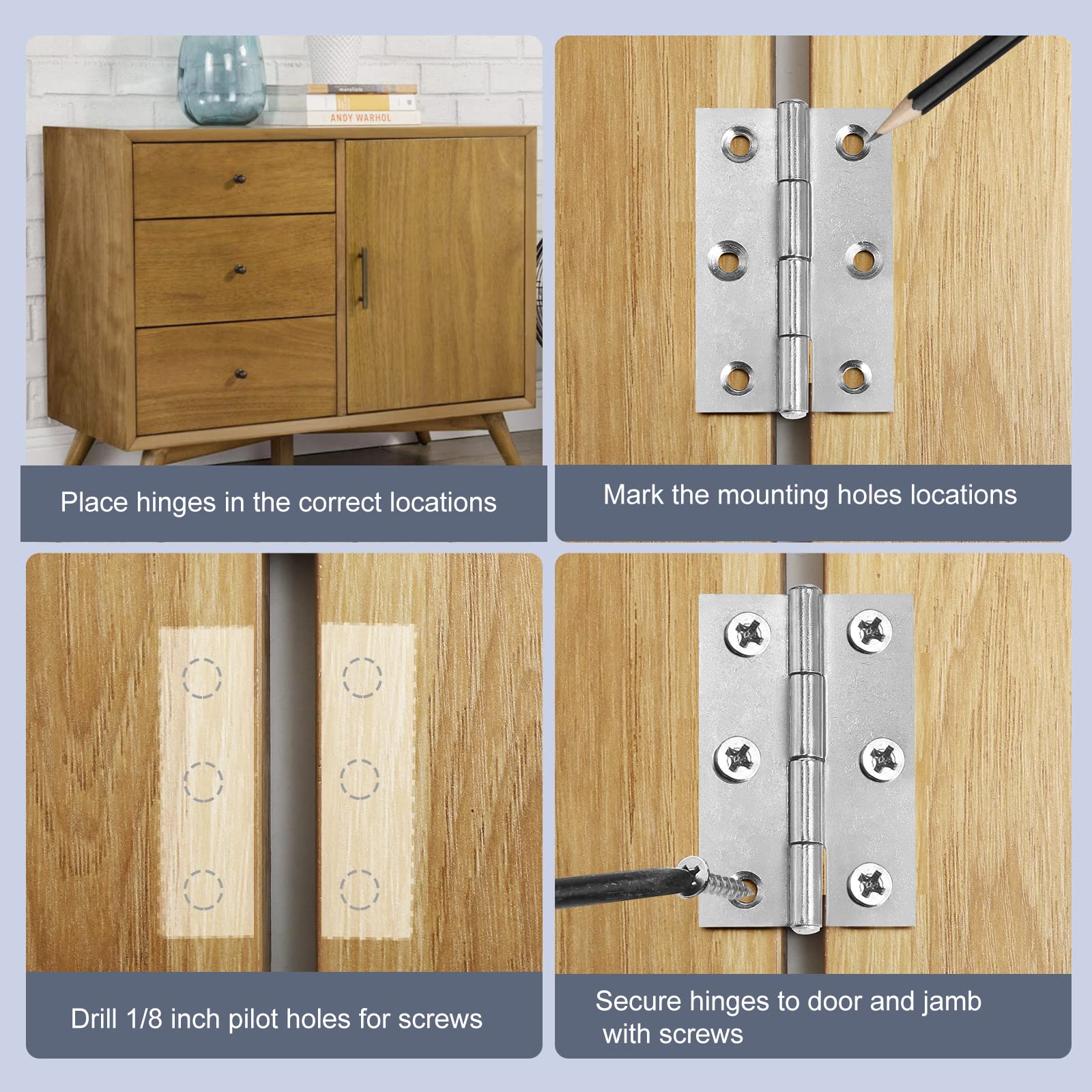 - MULTI-COMPATIBILITY: 12 x Cabinet Door Hinges and 72 x Mounting Screws. Whether your door opens left or right, you can use folding butt hinge.
