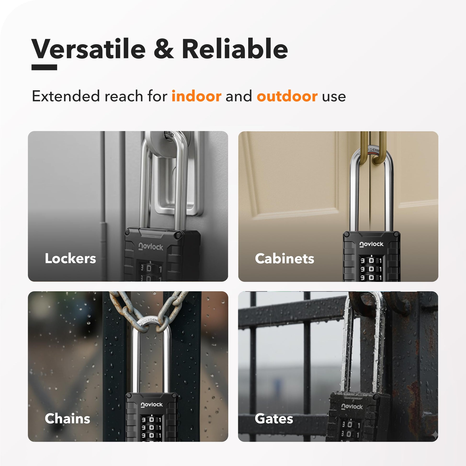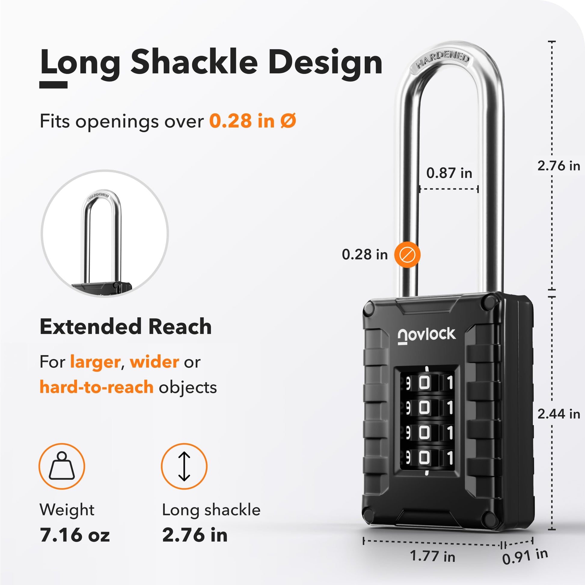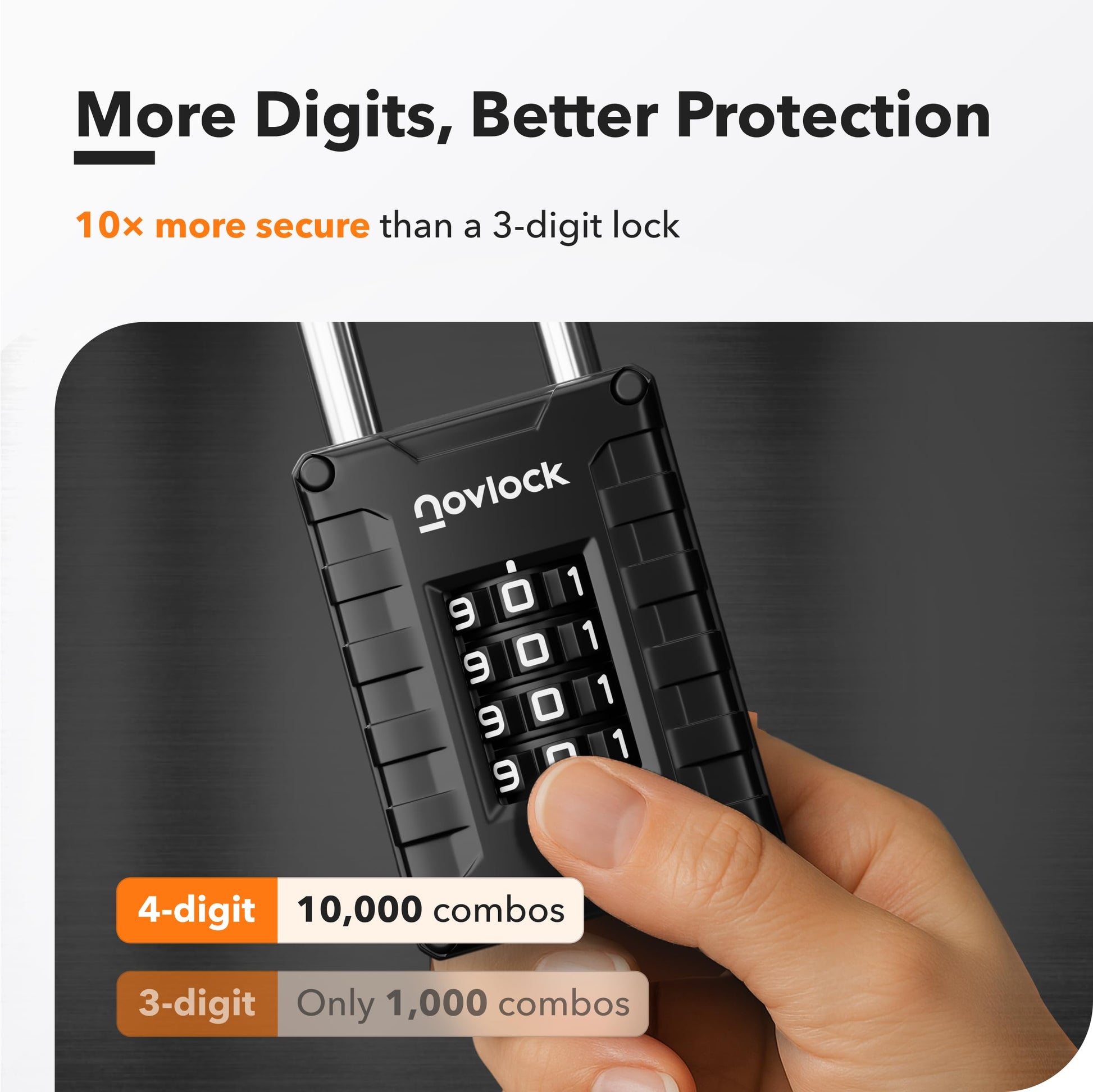 Details: Upgrade your security with the NovLock 4-digit combination padlock, featuring an extra-long 2.76" shackle for versatile use on lockers, cabinets, toolboxes, gates, fences, and sheds. Built with a solid zinc alloy body and hardened steel shackle, it resists impact, cutting, and tampering while remaining lightweight at just 7.2 oz. Ribbed, non-slip sides and large, easy-to-read dials ensure smooth operation, while 10,000 possible codes provide 10× more protection than standard 3-digit locks. A covered bottom reset switch prevents accidental resets, and every lock is individually hand-tested for lasting quality. Backed by a 5-year warranty, NovLock delivers reliable security and peace of mind for everyday use.