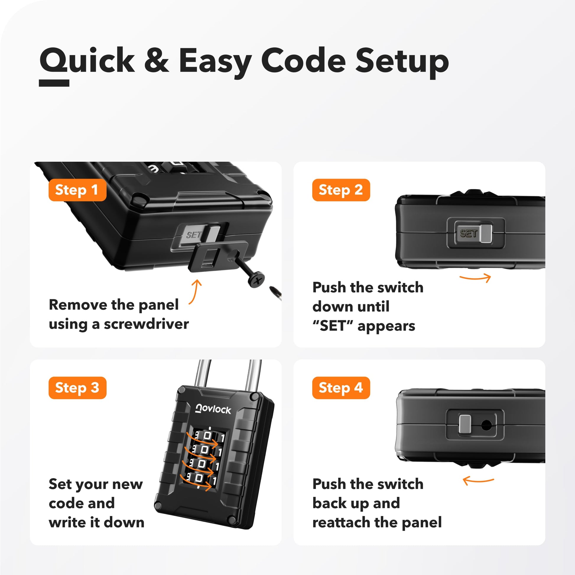 - 【4-Digit Combination】With 10,000 unique codes, this combo lock is 10× more secure than standard 3-digit locks. Setting and resetting take only a few steps. For added security, the reset switch is placed on the bottom with a protective cover to avoid accidental resets.