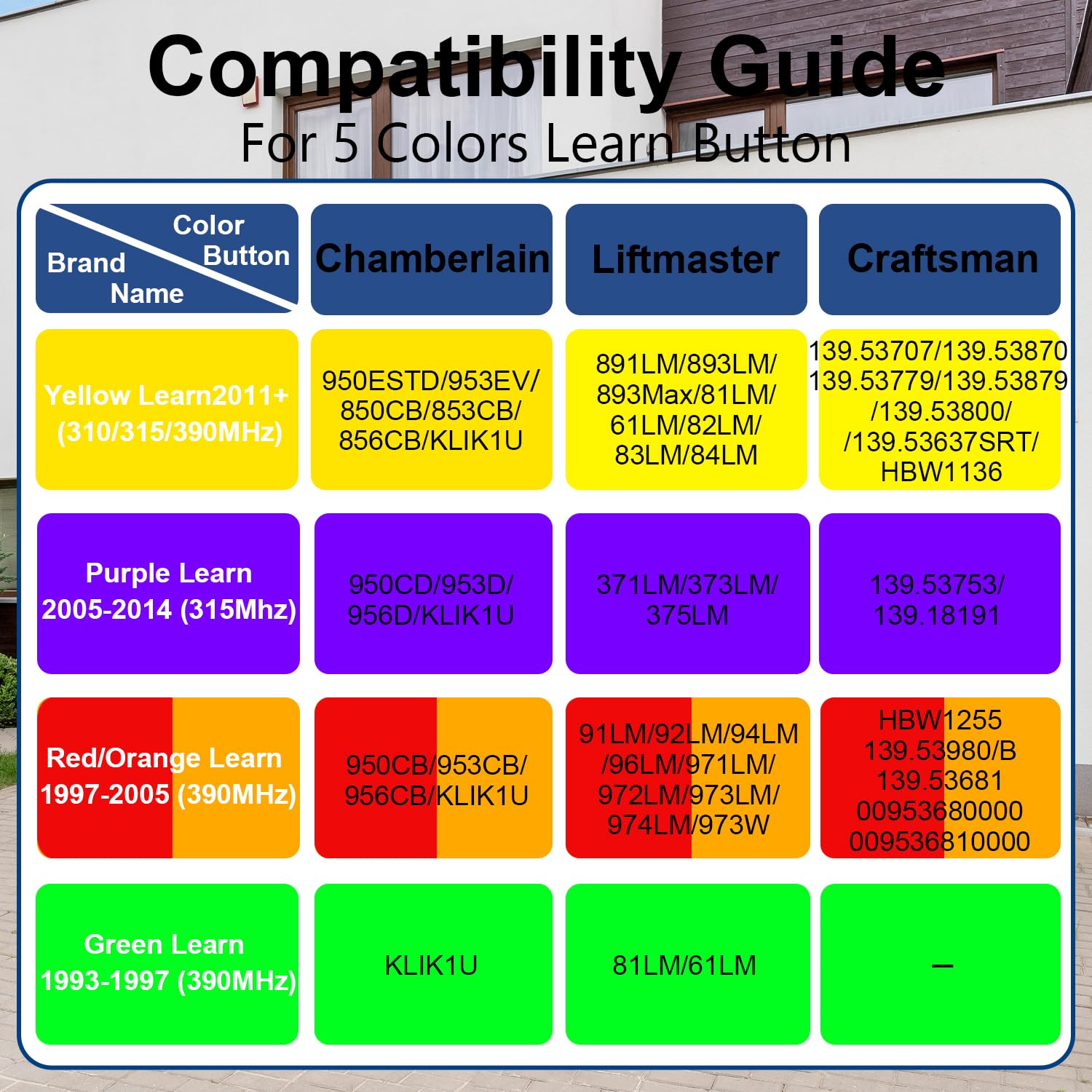 - Widely Compatible: Works on LiftMaster, Chamberlain and Craftsman garage door openers has a Red/Orange/Purple/Yellow learn button manufactured from 1993 to current, compatible with two different frequency safety scroll codes. Whether you're part of a multi-car family or need a replacement for lost or damaged remotes, our solution ensures hassle-free operation. Does not work for any DIP switches system! Not applicable to Genie!
