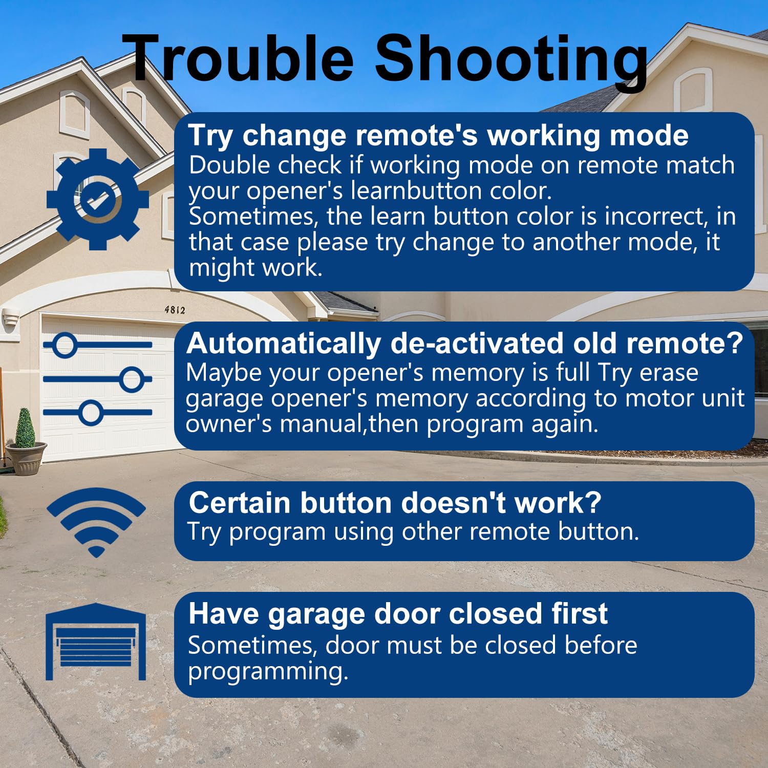 - EASY TO SET UP AND USE: With the two-color LED light design, the garage door pairing process becomes clearer and simpler. Say goodbye to complicated setup and enjoy a more pleasant and convenient user experience. The default mode of the garage door opener remote control unit is green LED light for red/orange purple learning button garage door opener, if you are using green/yellow learning button garage door opener, you need to change the mode of the remote control (please refer to the video or manual for how to change the mode).