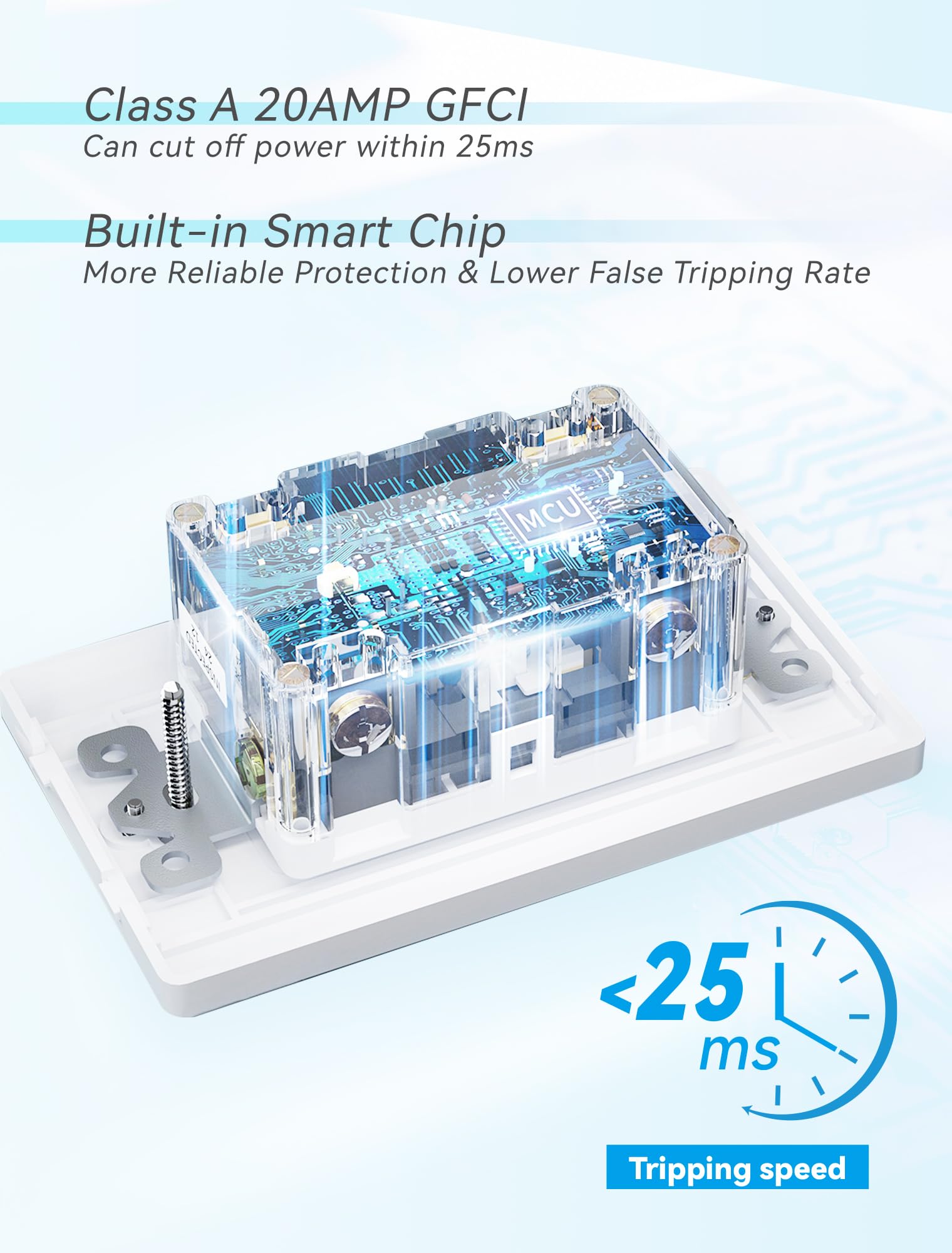- Advanced Chip for Enhanced Performance. Equipped with an Advanced Chip, this GFCI outlet delivers superior stability, fewer false trips, and faster response times. It detects ground faults at a threshold of less than 6mA and cuts power in under 25ms, providing reliable and efficient protection for your home or workplace.