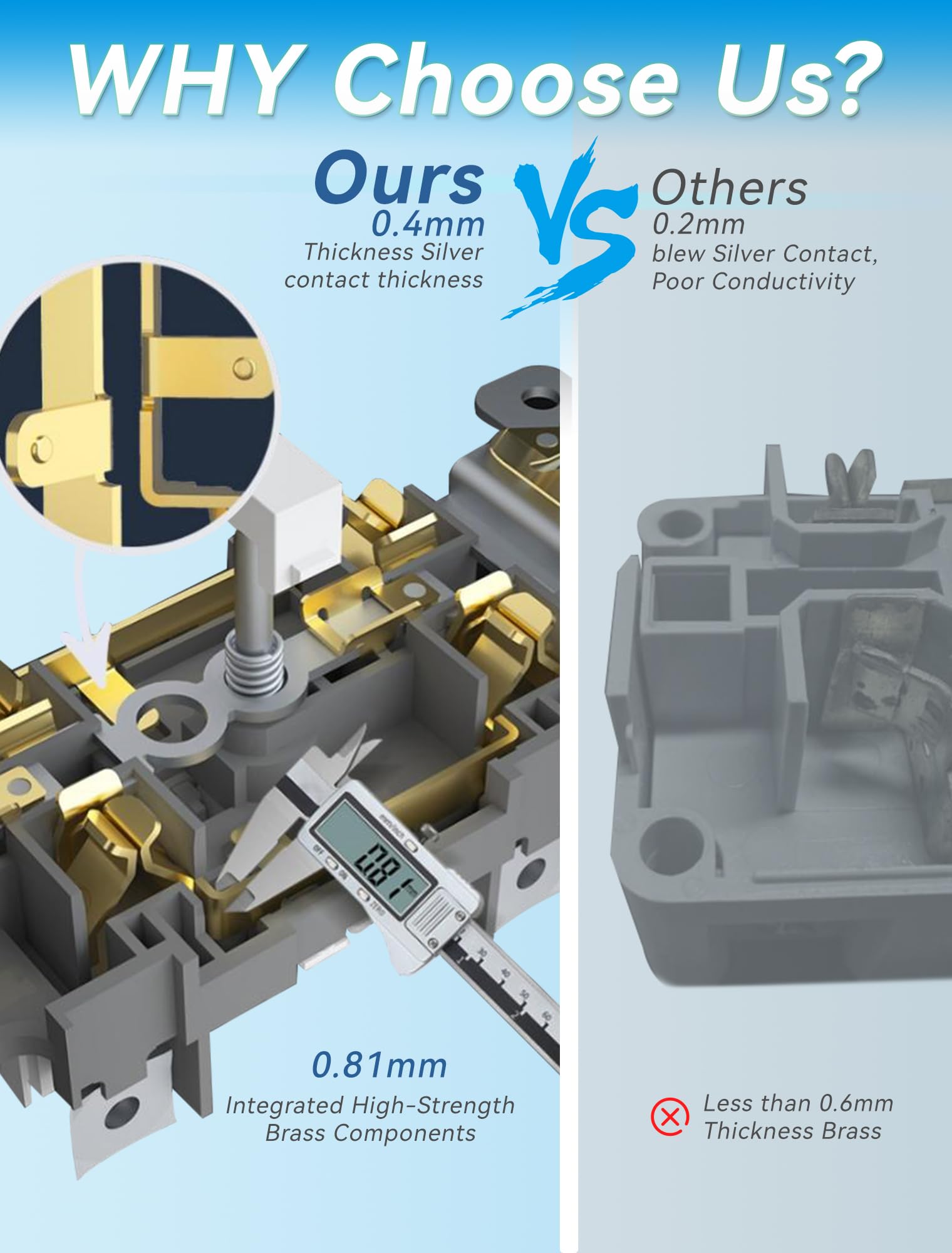 - Premium Materials for Long-Lasting Reliability. Built with 0.81mm Thick Copper and 0.4mm Silver-Plated Contacts, this outlet ensures efficient current transmission and reduced heat buildup. Its robust construction minimizes plug failure and enhances durability, making it a safer and more reliable choice for everyday use.