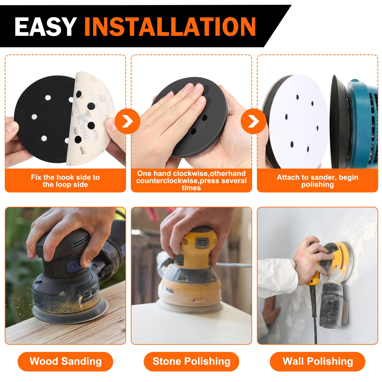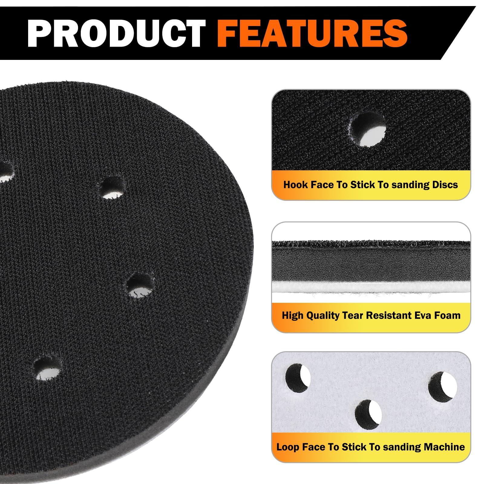 - HOOK & LOOP: The 6 inch interface pads fit between the sanding disc and sanding pads and have a HOOK side (black) for quick installation/removal of sandpaper and other pads. One side has a LOOP side for attaching H&L sanding discs and for attaching H&L sanding disc pads to sanders