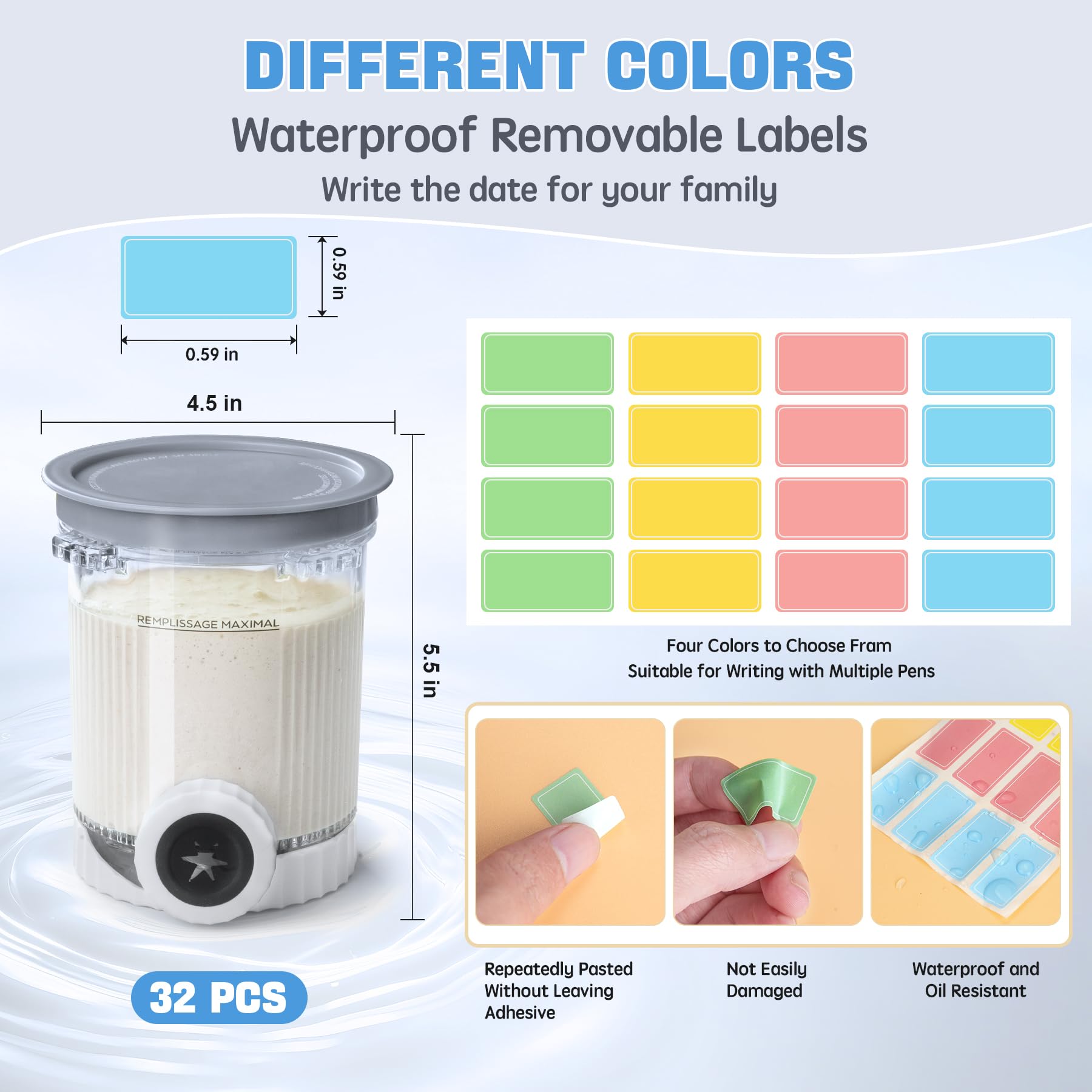 - COMPLETE MATCHING SET: This set comes with 2 pints & lids, 2 Nozzles, 2 spoons and 32pcs assorted colors waterproof removable labels can be writen flavor names/dates with pen and remove residue-free - ideal for allergy warnings or recipe experiments. Labels withstand freezer condensation without smudging.