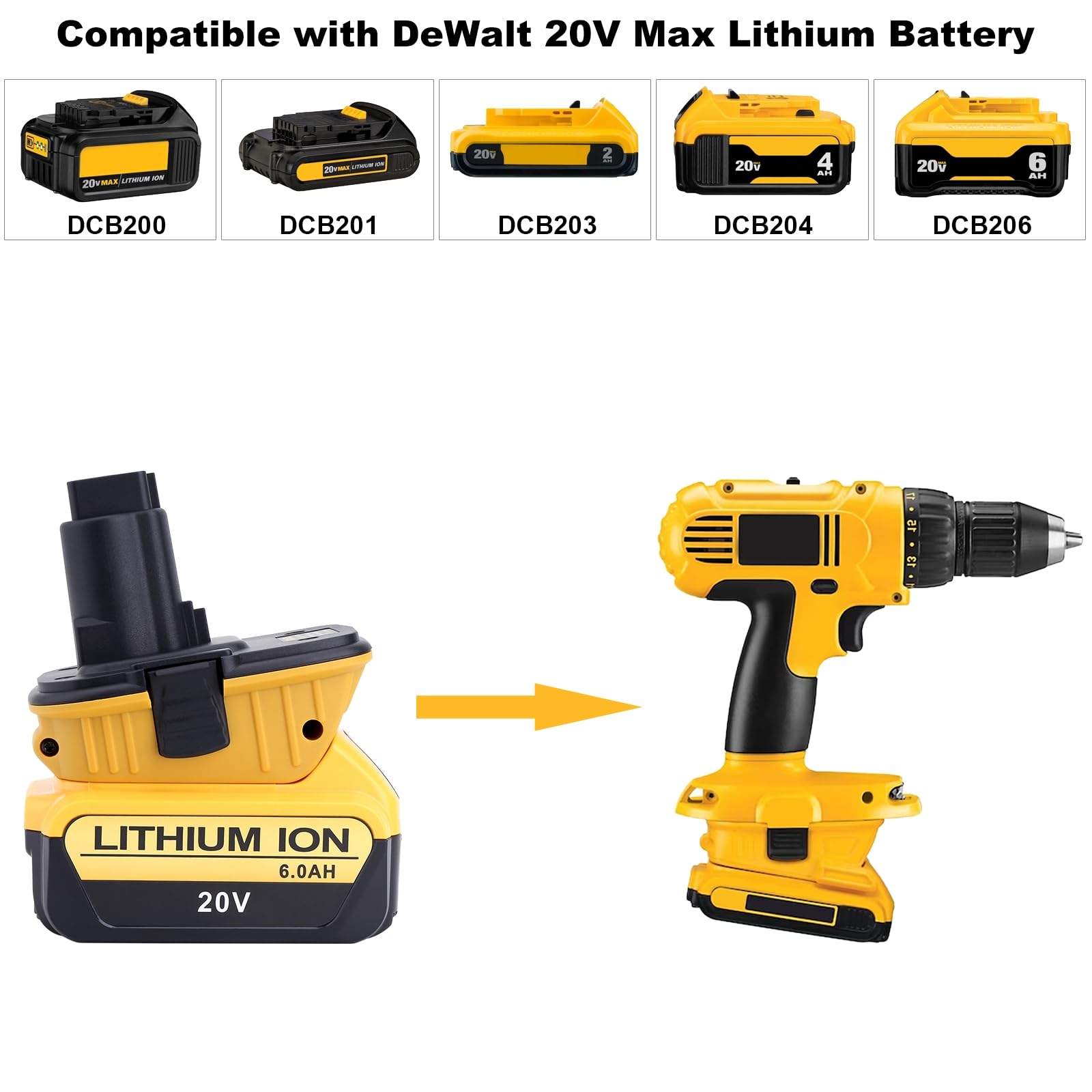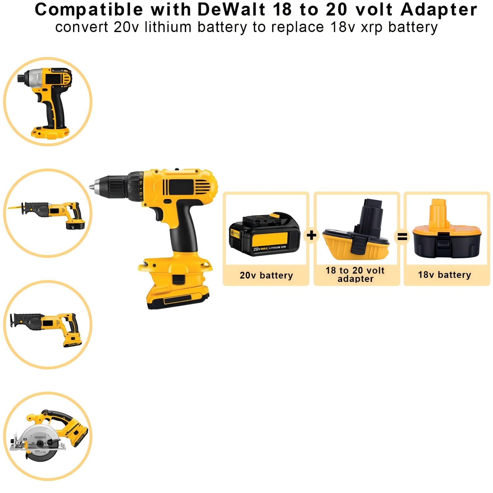 - Compatible with Dewalt 20V Batteries: The 18 to 20 Volt adapter is compatible with Dewalt 20V Max Lithium batteries and enables them to power 18V XRP tools. It's compatible with Dewalt 20V XR Batteries such as DCB200, DCB201, DCB203, DCB204, DCB206, and also 20V/60V Max Batteries like DCB606, DCB609, and DCB612, thereby broadening your tool's power alternatives and application prospects.