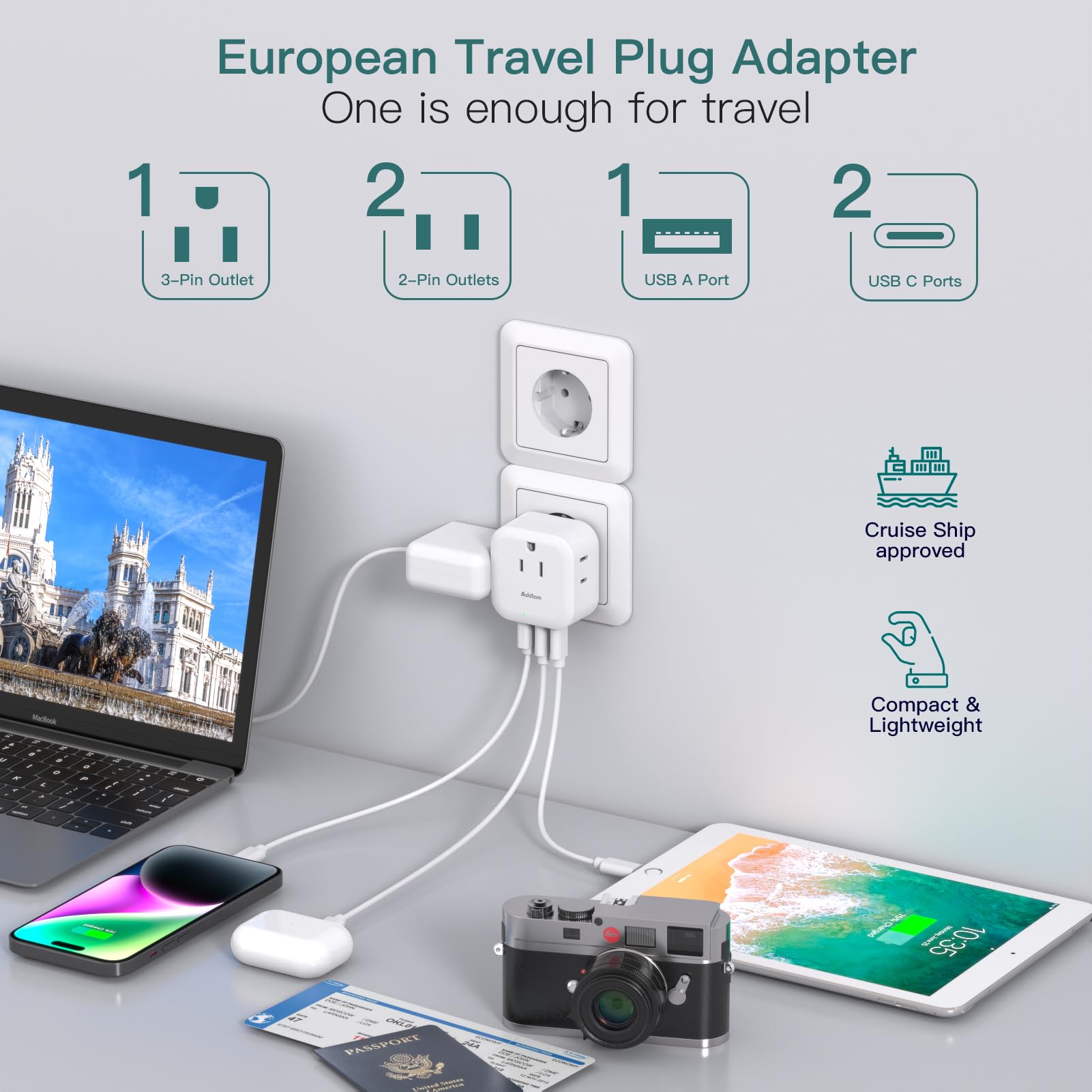 2 Pack European Travel Plug Adapter, US to Europe Plug Adapter with 3 Outlets 3 USB Charging Ports(2 USB C), Type C Adapter Travel Essentials to Most Europe EU Spain Italy France Germany Iceland