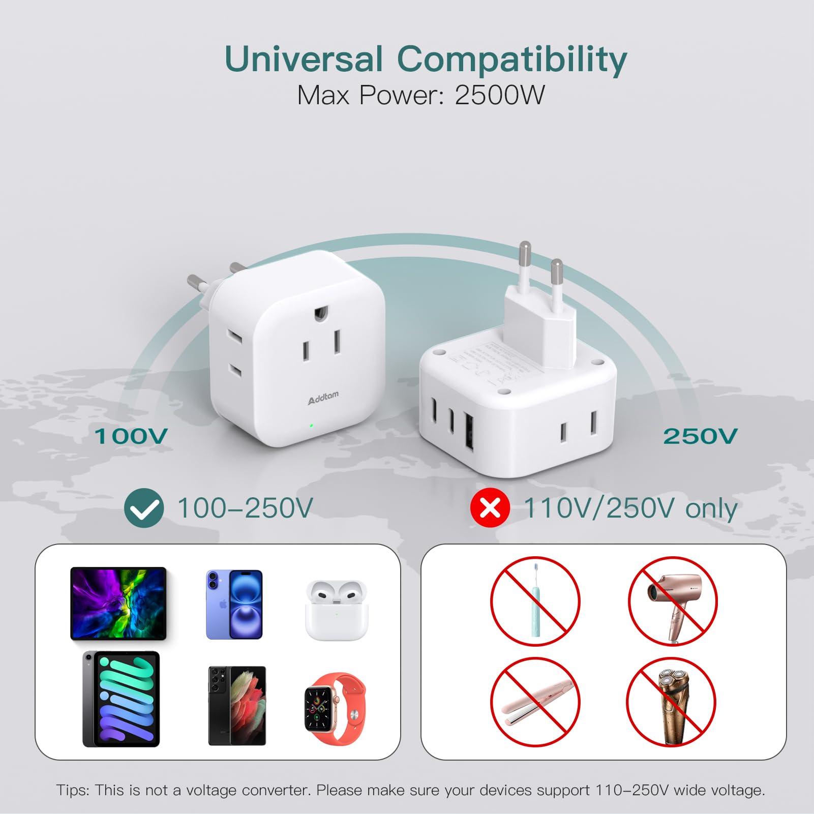 - 【Warning】- This is not a voltage converter. This European plug adapter is only compatible with devices with a wide voltage range of 100V to 250V. If you intend to use hair dryers, straighteners, electric toothbrushes, or razors, make sure they support 100V-250V dual voltage. Otherwise, you will want a power voltage converter to utilize them securely. (Addtam provide 12-month warranty friendly customer service.)