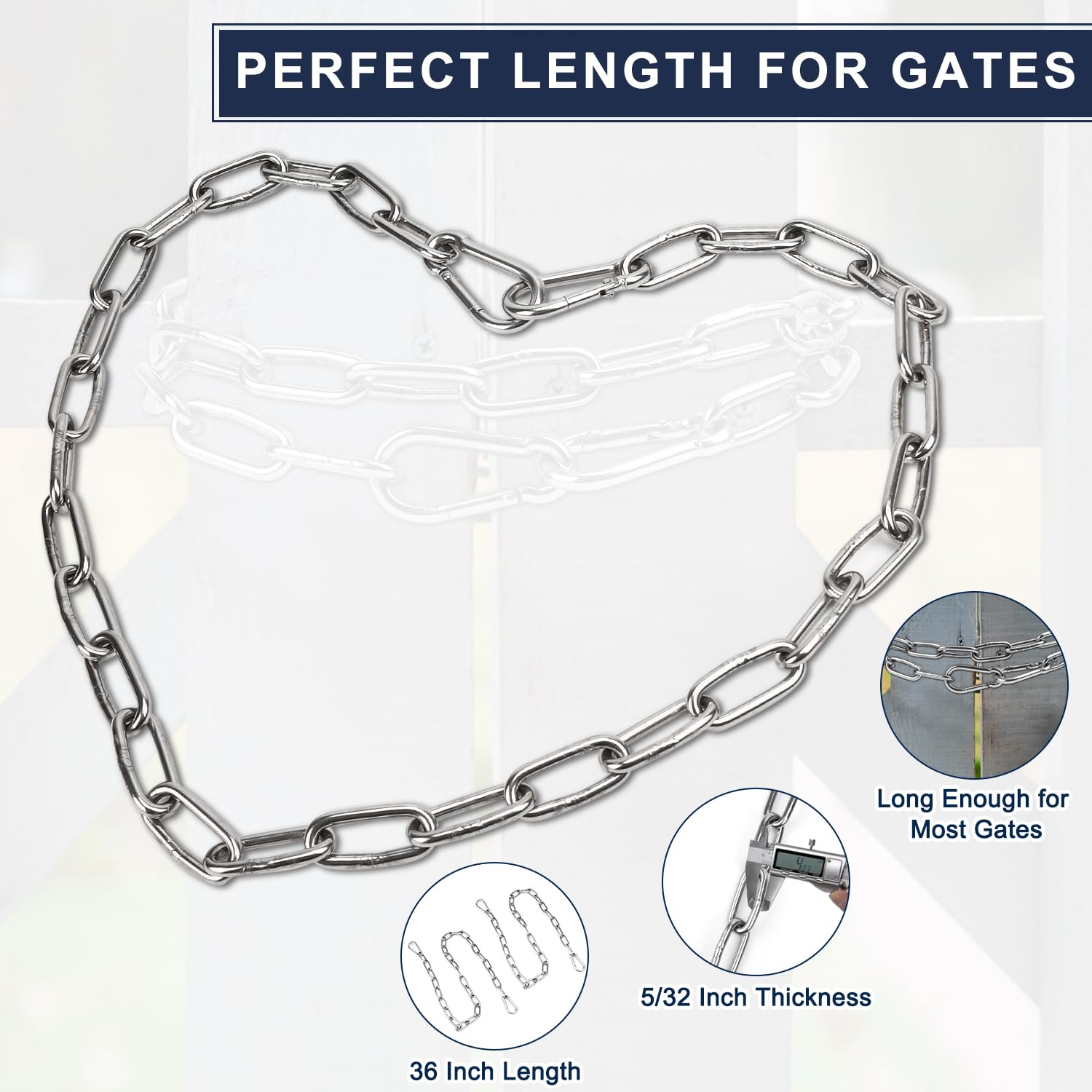 - ADJUSTABLE GATE CHAINS WITH CLIPS - 2pcs * 5/32 * 36 inch, perfect length with two carabiners on each chain, easy to adjust and fasten pretty much any gate.