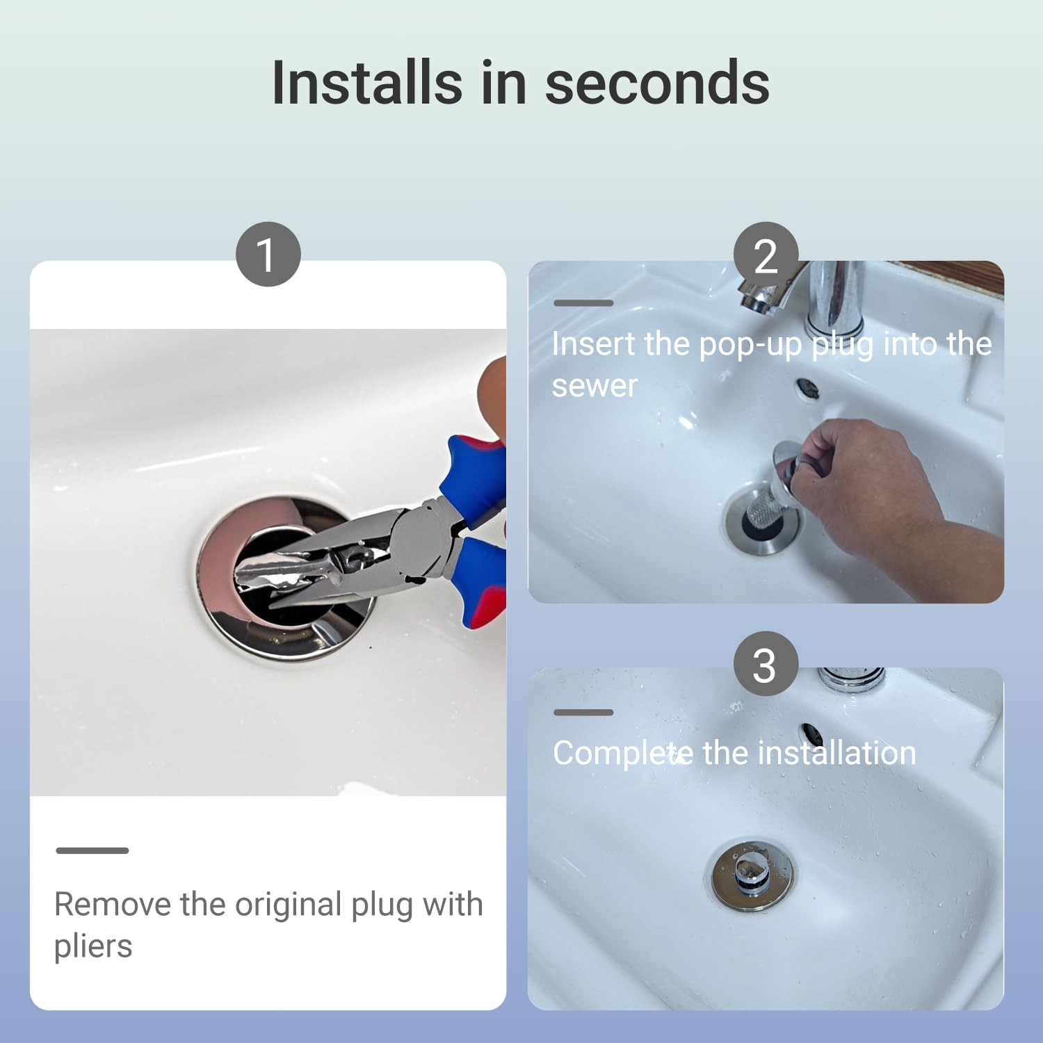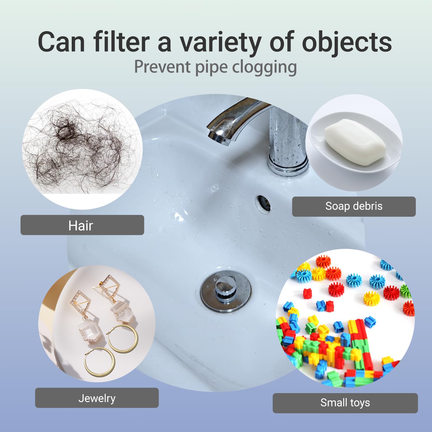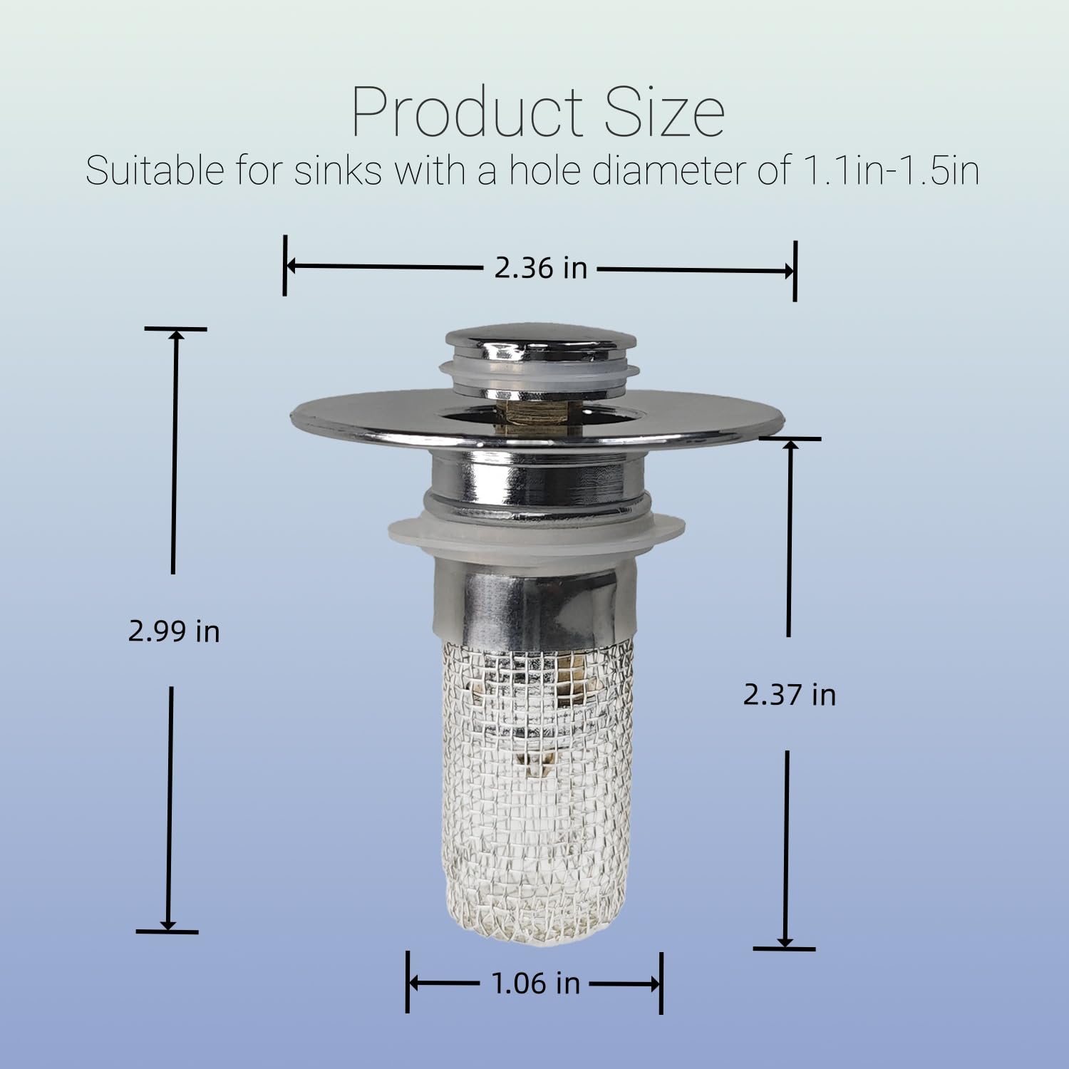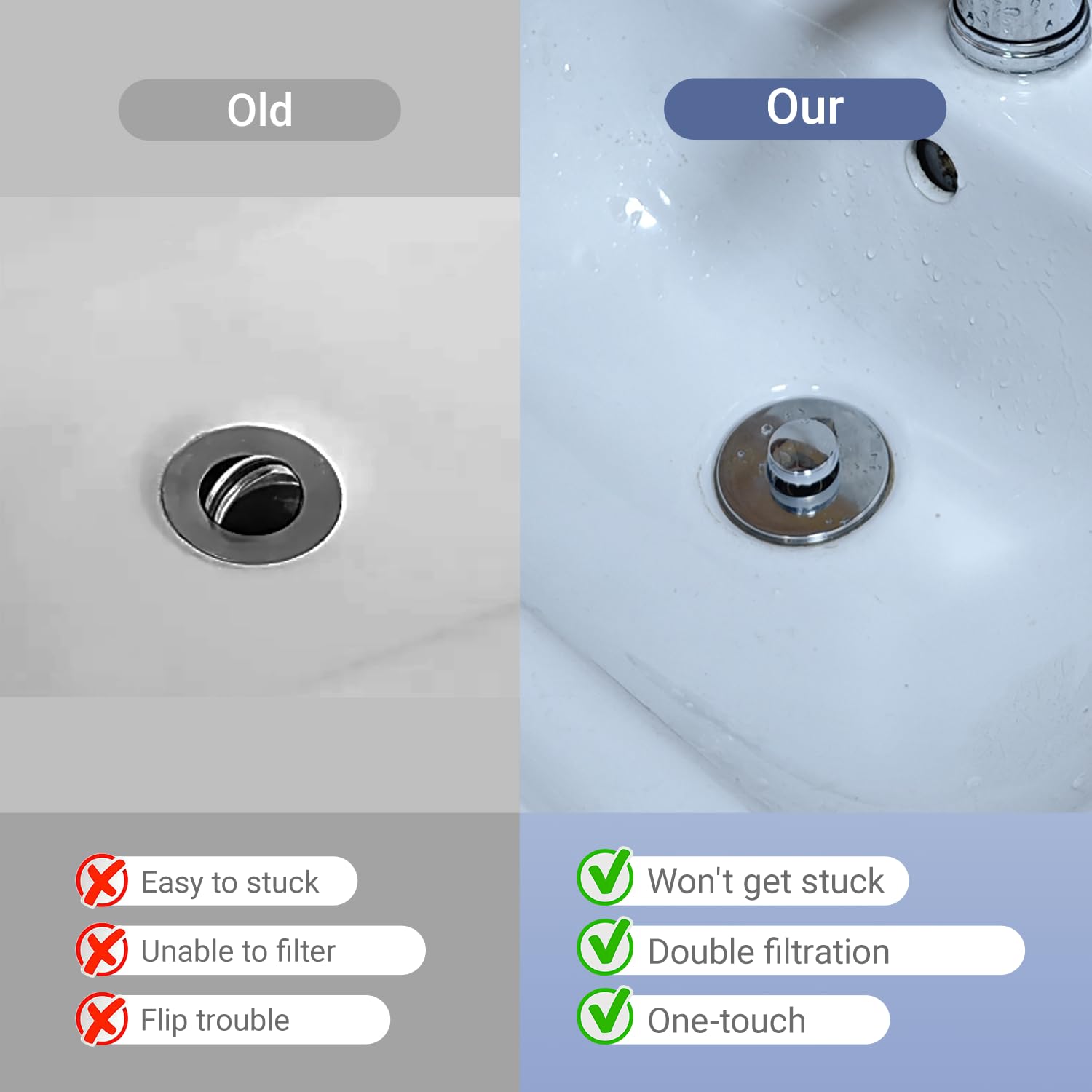 - 【2-in-1 Drain Stopper & Hair Catcher】Universal bathroom sink stopper combines pop-up drain plug with clog-proof basket strainer, effectively trapping hair, soap residue and debris while allowing fast water flow. Specially designed anti-clogging basket replaces traditional sink stoppers