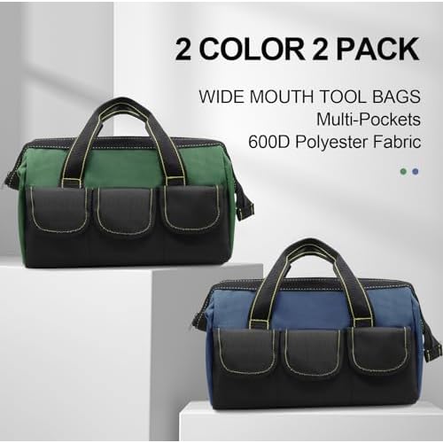 - Sufficient Quantity: The package contains 2 tool bags, blue and green, size: 16 inches x 10 inches x 7.8 inches. This tool bag offers an open top for quick access. There are 5 external pockets to keep your tools organized and say goodbye to the time of rummaging in the cabinet.