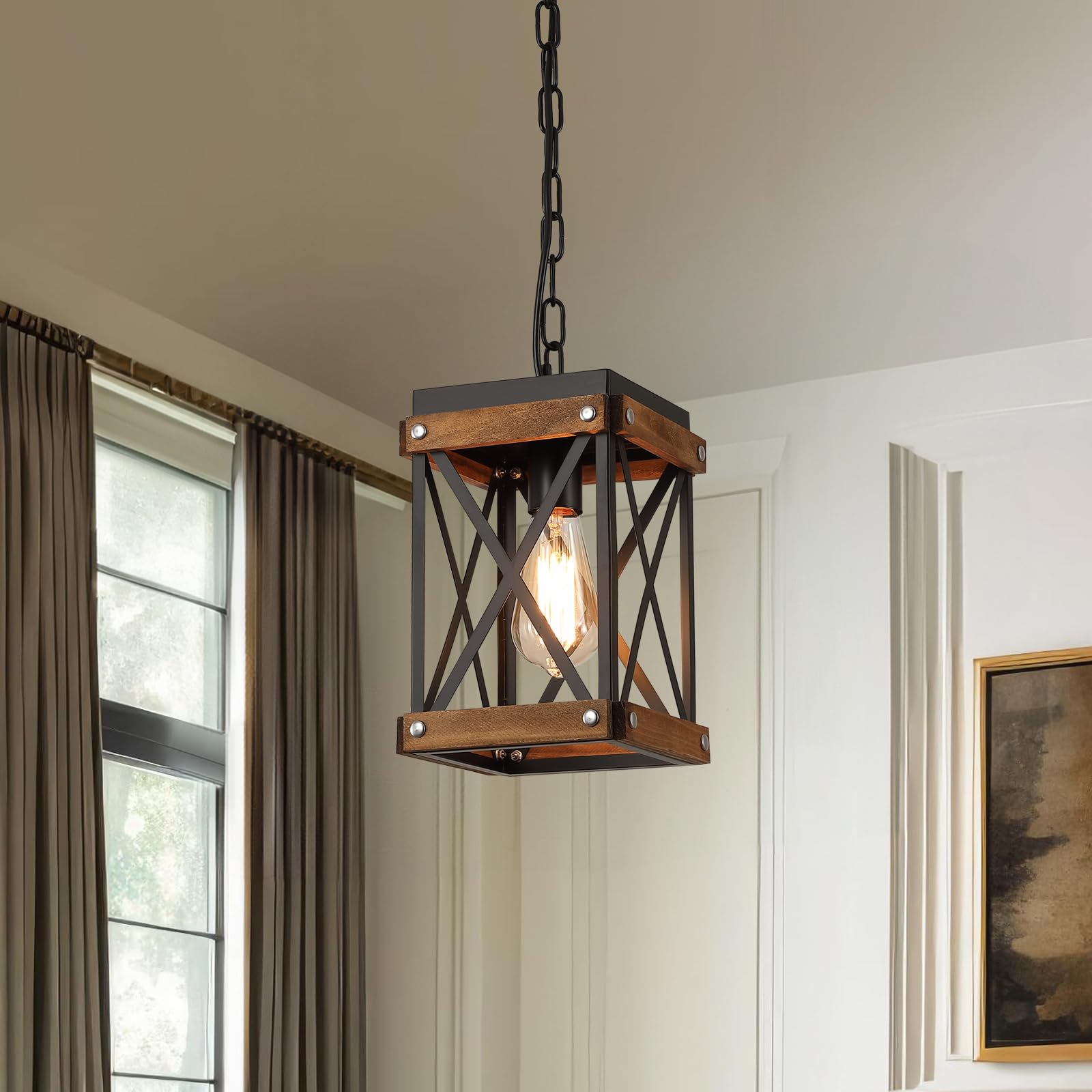 2 Pack Rustic Farmhouse Plug in Pendant Light Fixture with Adjustable Chain, Oak Wood and Metal Lantern Cage Mini Hanging Lamp for Kitchen Island Living Room Hallway Farmhouse Bar, Black