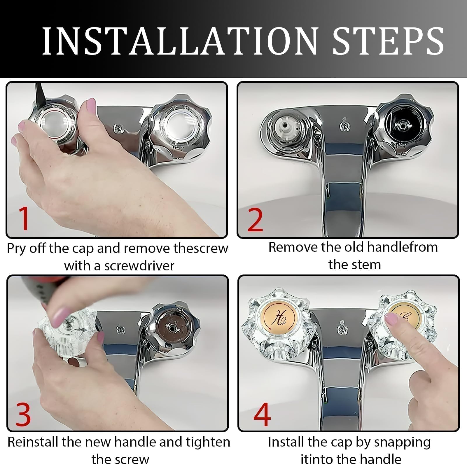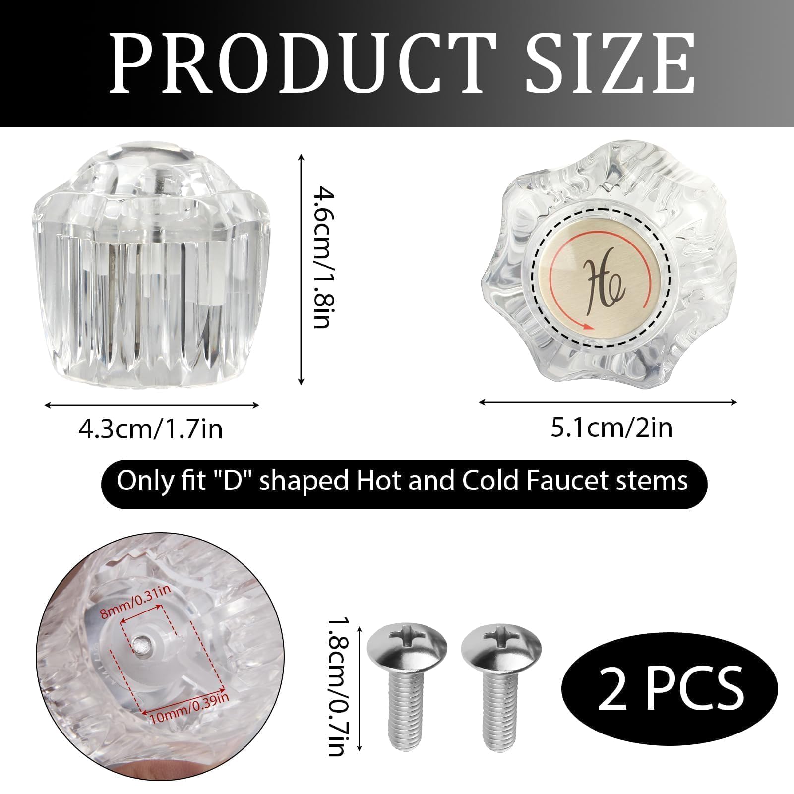 - Kit Contains: The faucet handles contain 2* clear acrylic handles, 2* handle screws, and 2* index buttons with marked cursive hot and cold stamping.(Only fit “D” shaped Hot and Cold Faucet stems)