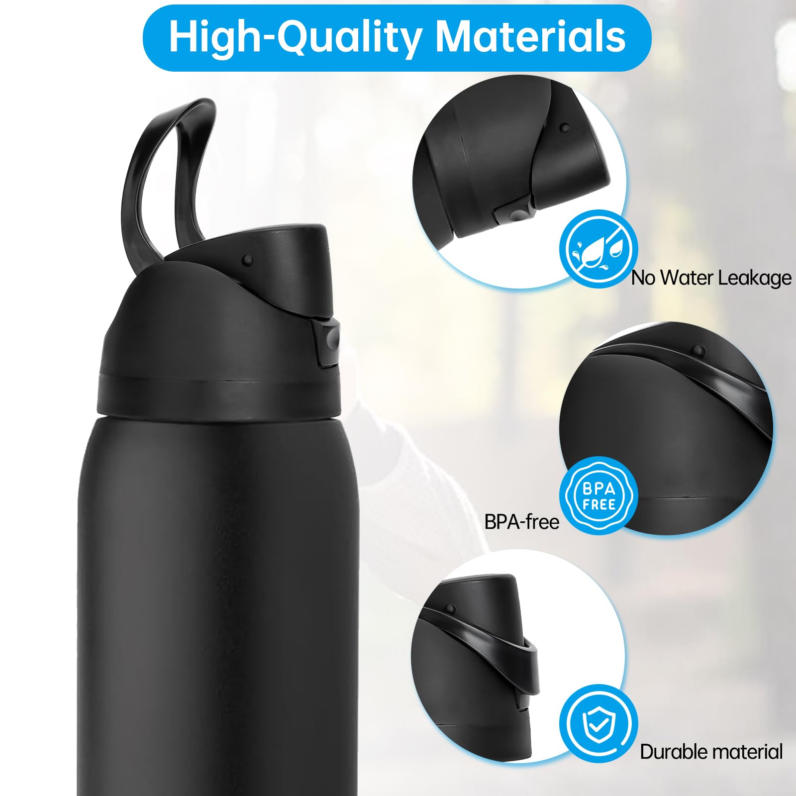 - Our water bottle lids are crafted from premium plastic, ensuring durability, sturdiness,odorless,BPA-free safety and reusable for daily use.They are dishwasher safe and built for long-lasting use, perfectly suited to meet your daily needs.