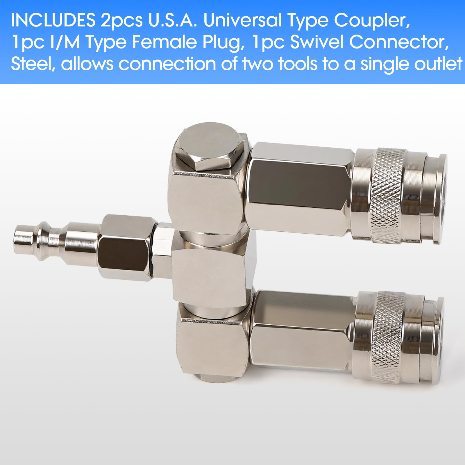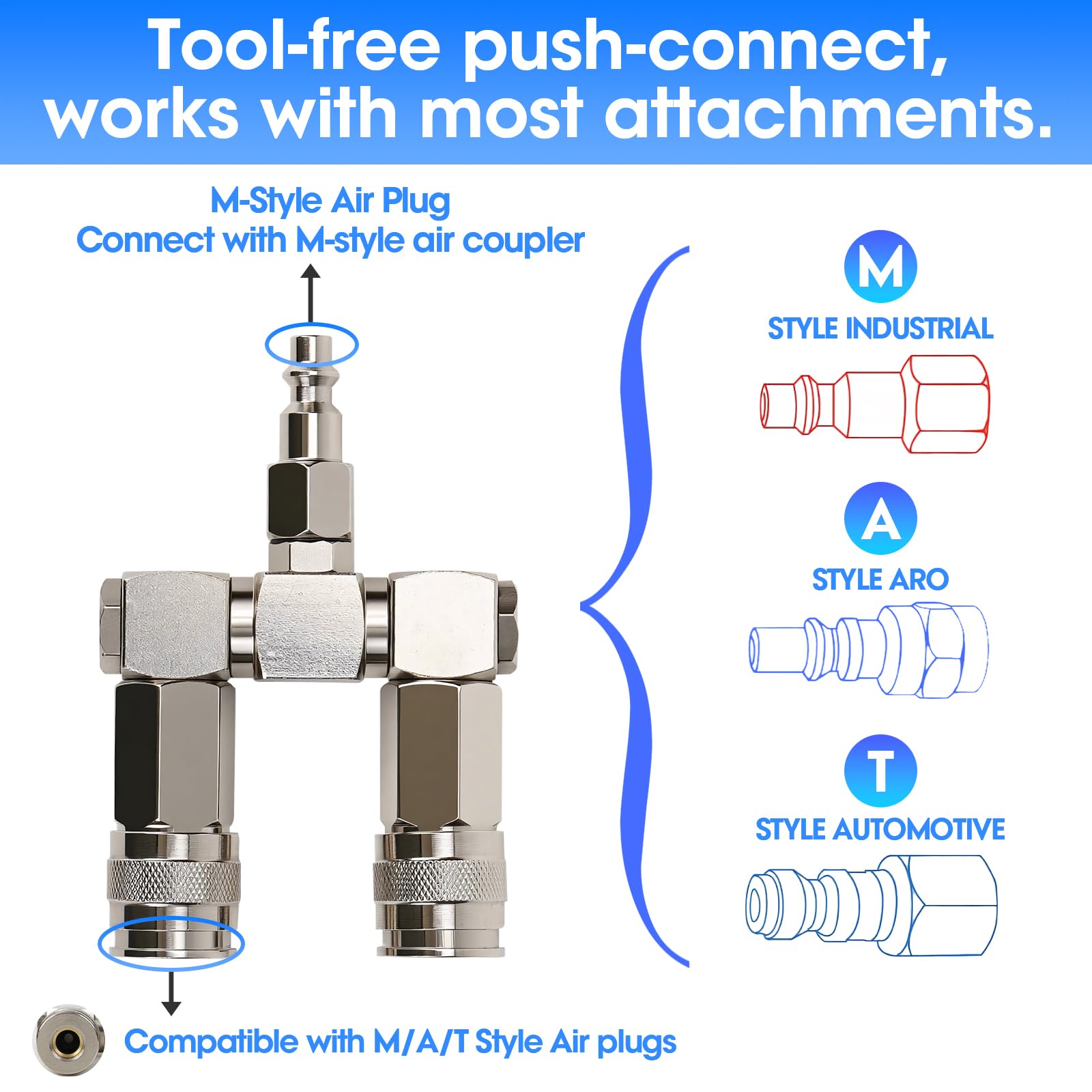- 【Universal Quick Connect for Air Tool Fittings】Included 2 universal couplers and 1 I/M-type plug are compatible with "A", "T", and industrial-style air fittings. The push-to-connect design enables tool-free installation, ideal for air hose quick connect systems and compatible with most air compressor attachments.