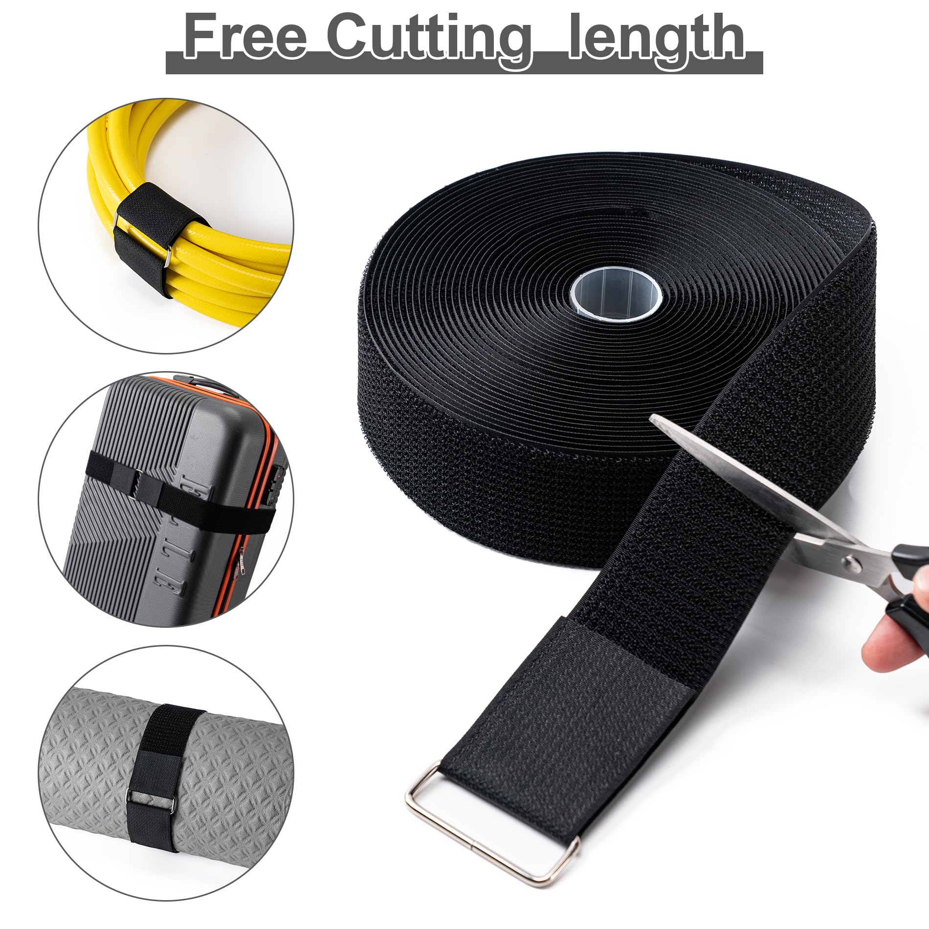 2" x16Ft Hook and Loop Straps with 12 Metal Buckles, Adjustable Fastening Cable Straps, Free Cut Length, Reusable Nylon Cable Ties for Organizer or Storage, 2 inch Wide Black