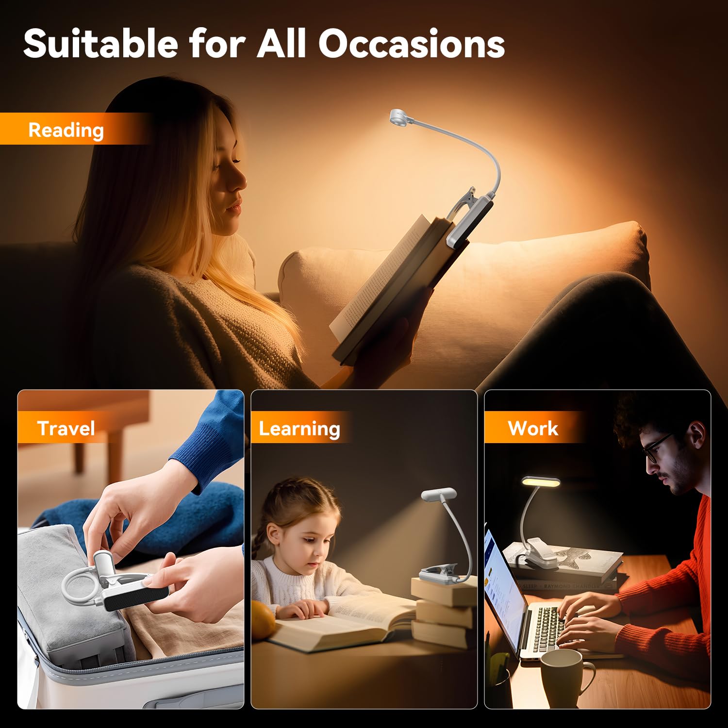 - Premium Quality & Clip On Design: Our book reading light made with shock resistant ABS material and silicone-padded clamp to prevent scratches. The ultra-strong clip securely attach to books, e-readers, laptops, headboards or anywhere else without worrying about slipping