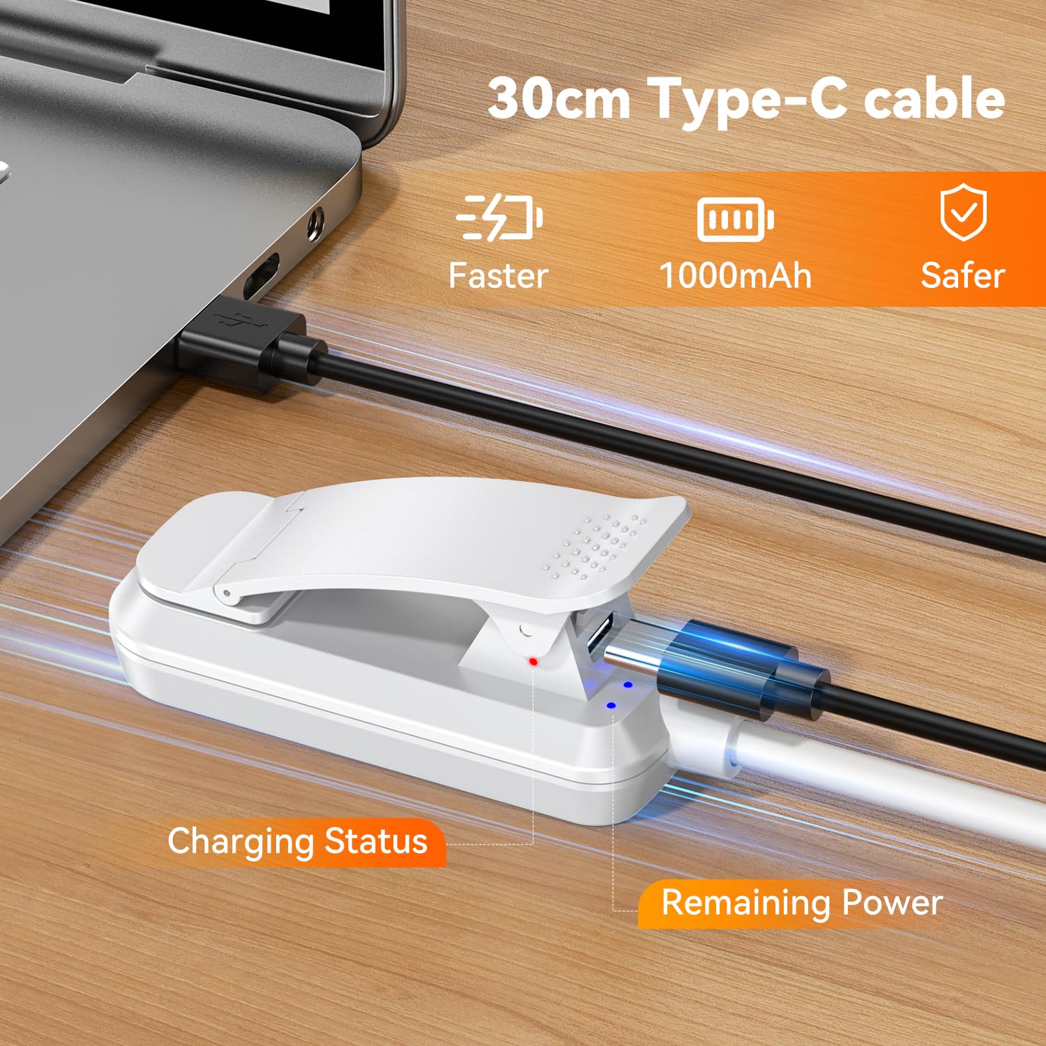 - Long Lasting Rechargeable Battery: 1000 mAh high-capacity battery, enjoy up to 100 hours of continuous use on a single charge(lowest brightness). The rechargeable book light only takes two hours to fully charge via USB-C cable, and 4 LED indicators can show the real-time power level