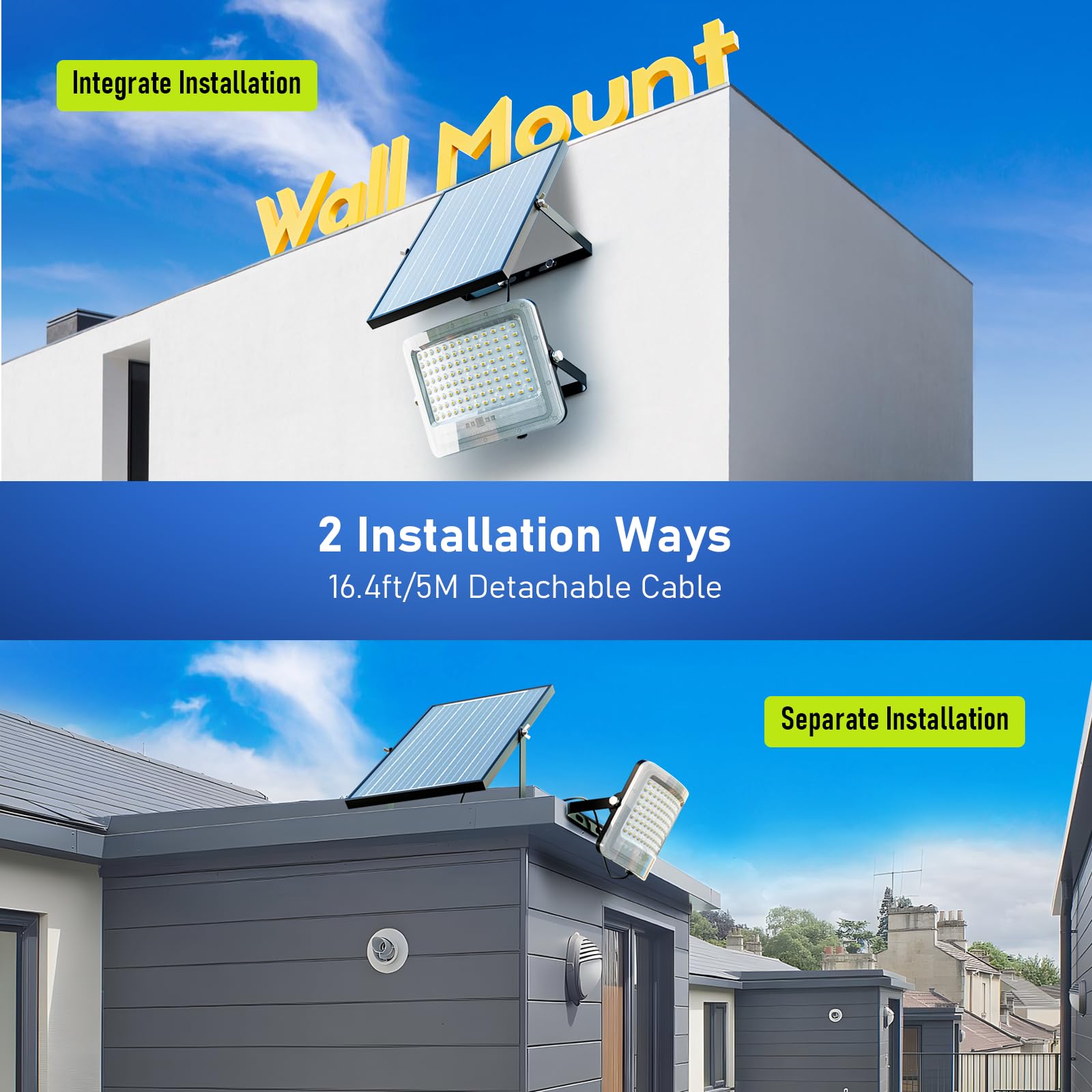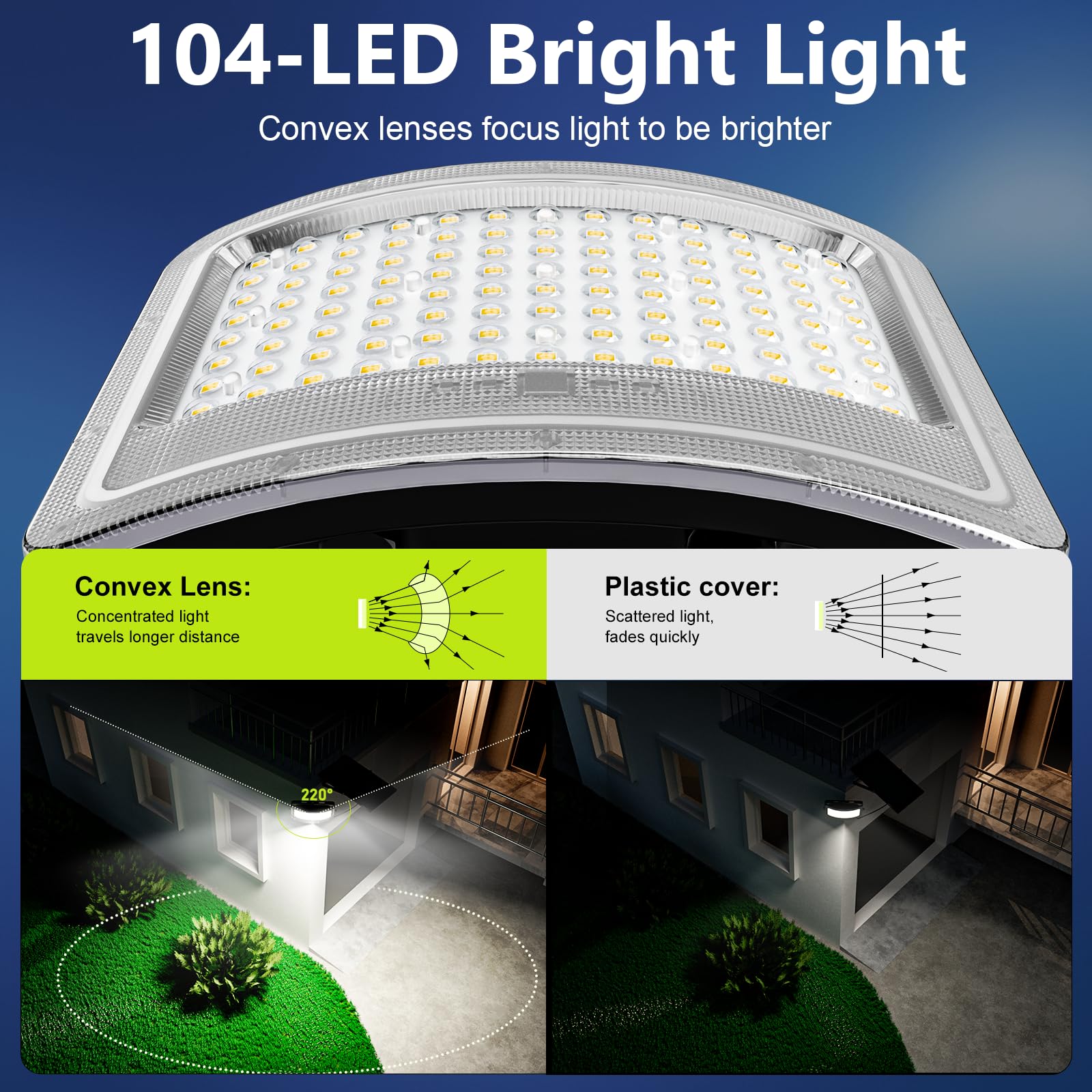 - Solar Flood Lights Outdoor: Our solar outdoor light with 104 ultra-bright LED, 6500K LED solar flood light can illuminate an area of more than 16.4ft. It will provide brighter, more evenly distributed light wherever you install it