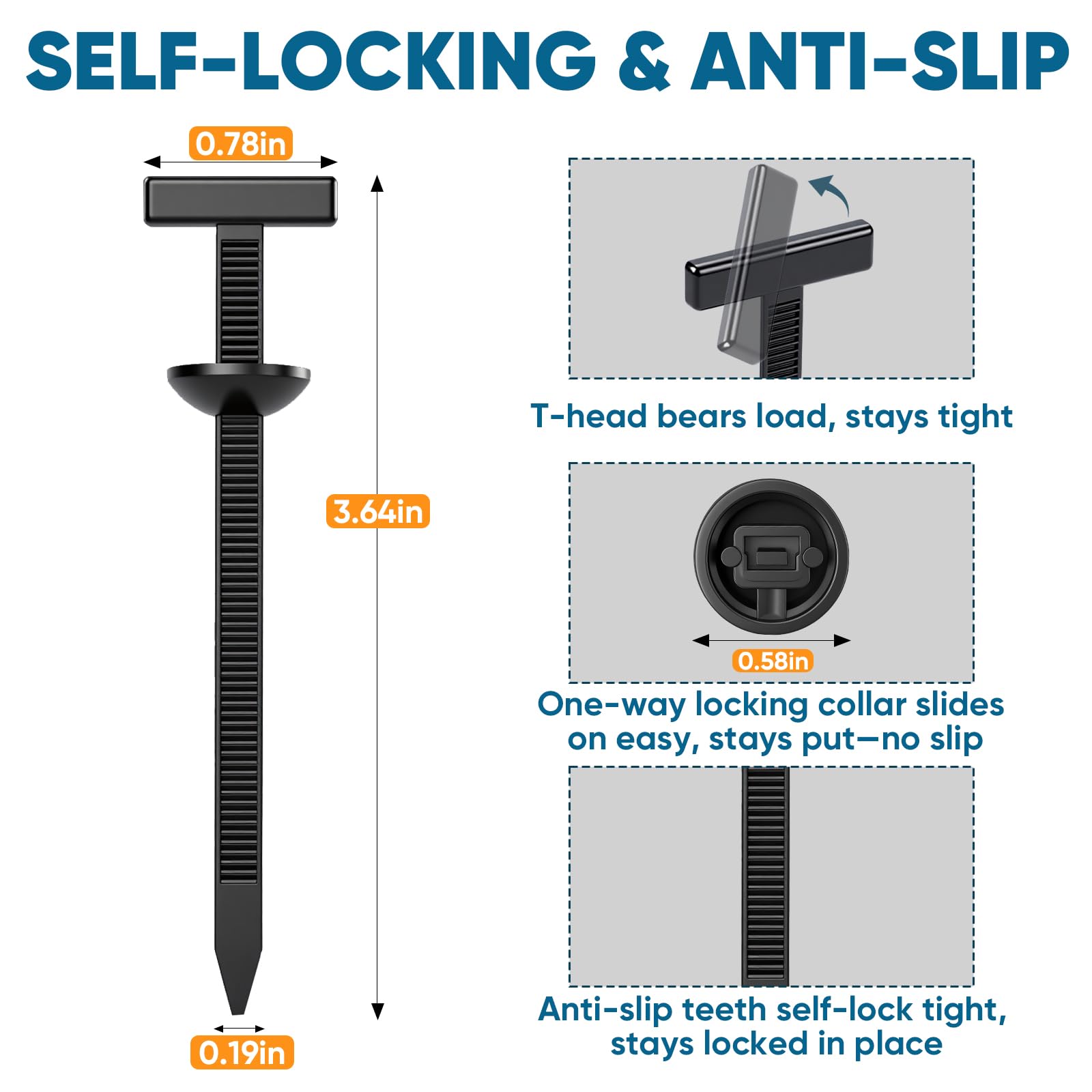 - 【TOOL-FREE QUICK INSTALLATION】Two easy methods: 1. Fold and push the T-head into holes (≥0.33in); 2. Insert tail through smaller holes (≥0.2in) if space allows. Cut excess after locking—saves 50% time vs. traditional fasteners, perfect for emergency repairs.