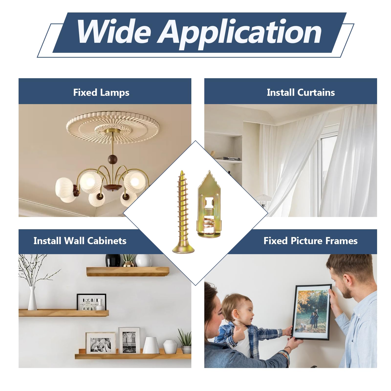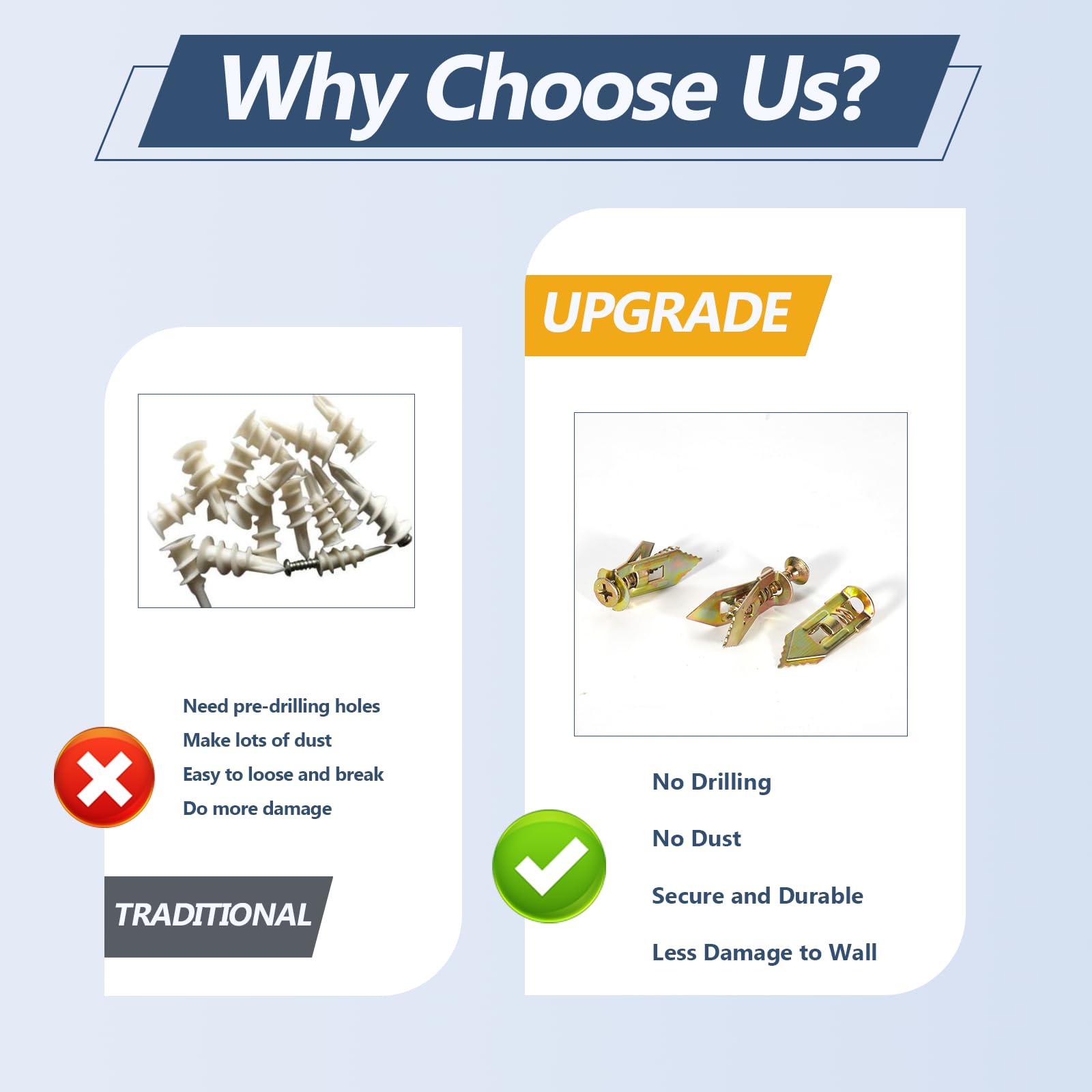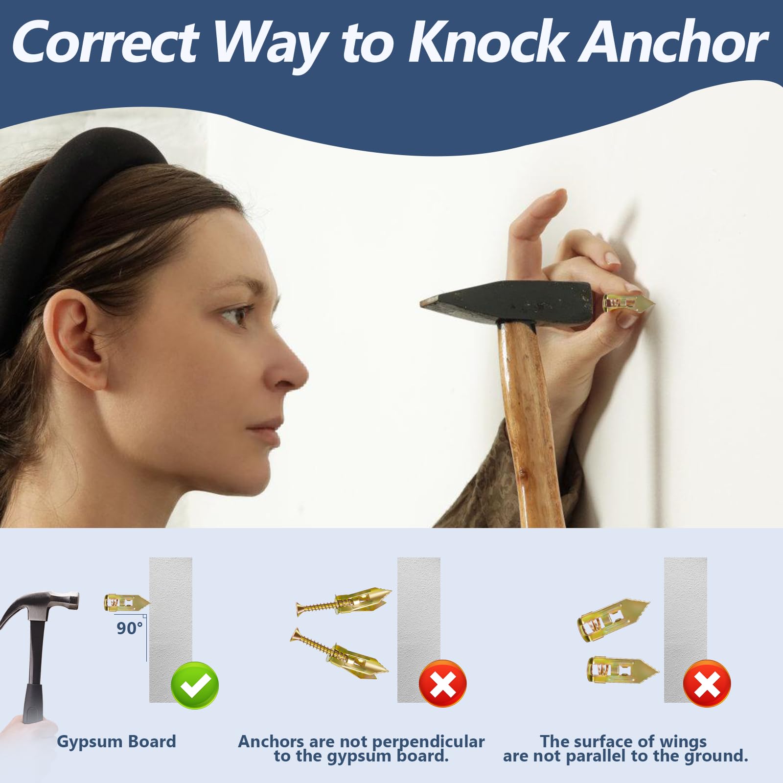 - “Time Saving” —— NO NEED pre-drilling of these wall anchors. Ease of installation, use and tripping. Easy 3-step process—knock in the anchor, thread the screw through the fixture and tighten. Metal expansion bolts for drywall is safer and quicker than traditional plastic anchors that risk wall cracking, no dust or mess
