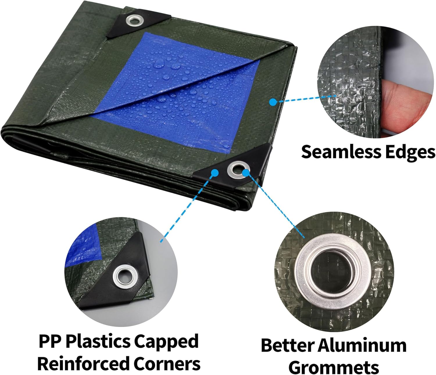 - 【Double-sided use· Reinforced edges】Our tarp can be used on both sides, one side is green, the other side is blue, you can choose the appropriate color according to your needs.The edges of the tarp are reinforced to fit,metal grommets every 35 inches.