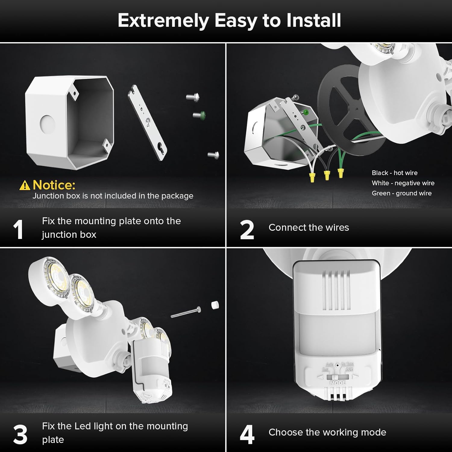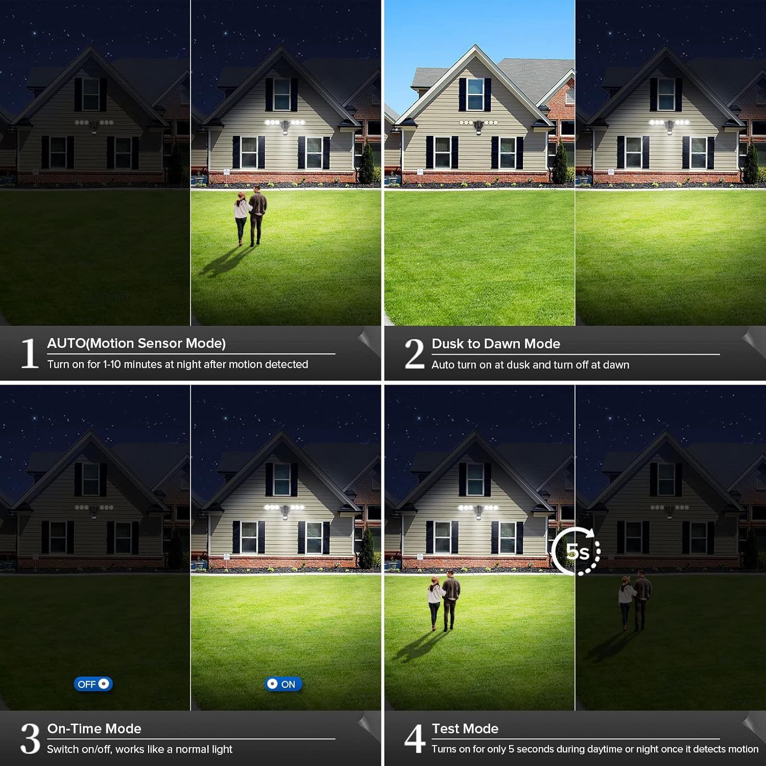 - 4 Modes Control: with the most used AUTO Motion Sensor Mode, this motion sensor outdoor lights also provided 3 other modes for different needs; Dusk to Dawn Mode :Auto turn on at dusk and turn off at dawn; On-Time Mode: Manual control lights keep ON by switch; Test Mode:Detect ambient motion to turn on the light for 5 seconds then automatedly turn off