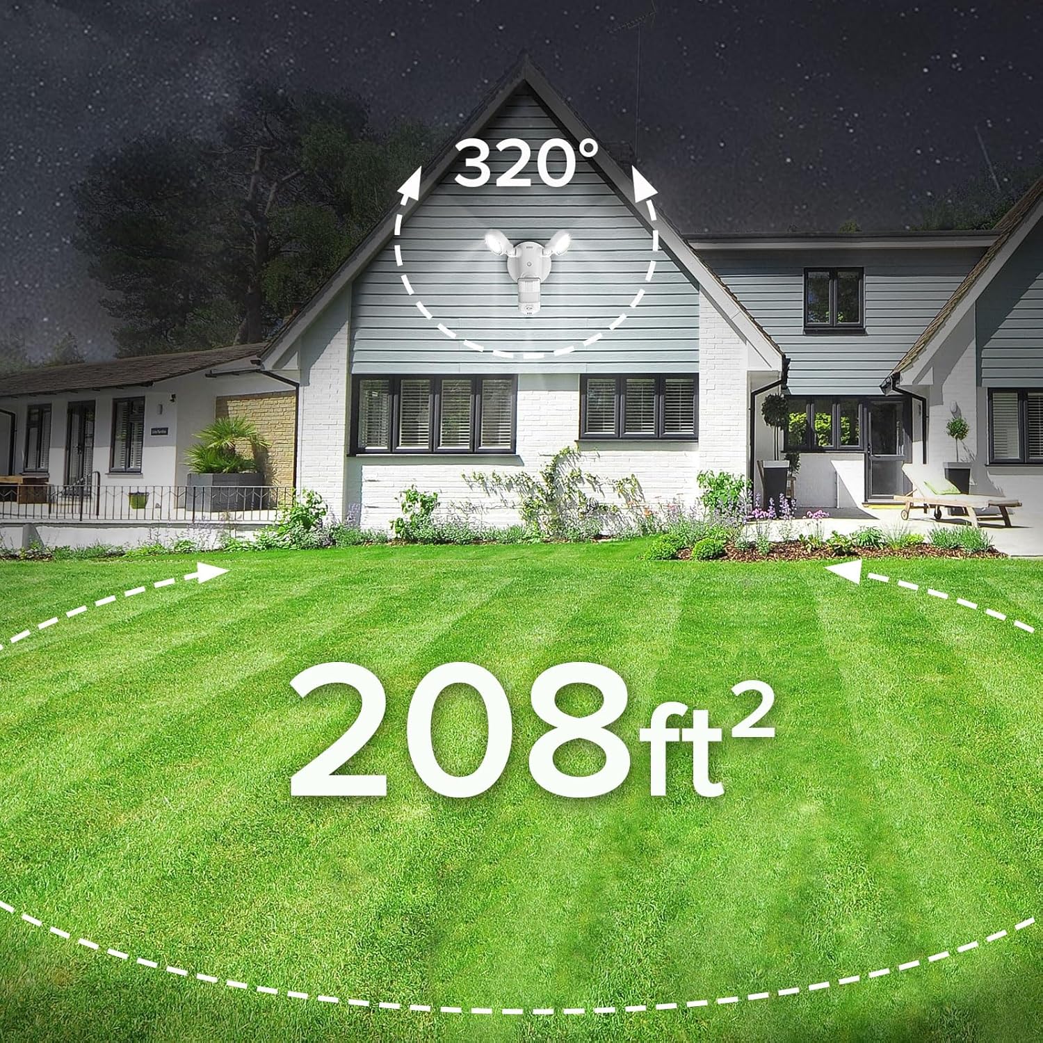 - Motion Sensor: Dusk to dawn outdoor lighting can be triggered by moving human, cars and animals up to 72 feet sensing range at 320° detection angle, Lighting time can be adjusted from 10s to 10mins; keep your home secure 24/7. This outdoor motion security light can be installed for soffit/eave mounting or wall mounting by following a few wiring steps. Good lighting solution for dark areas like middle sized backyard, front door, garage, driveway, sidewalk,etc.