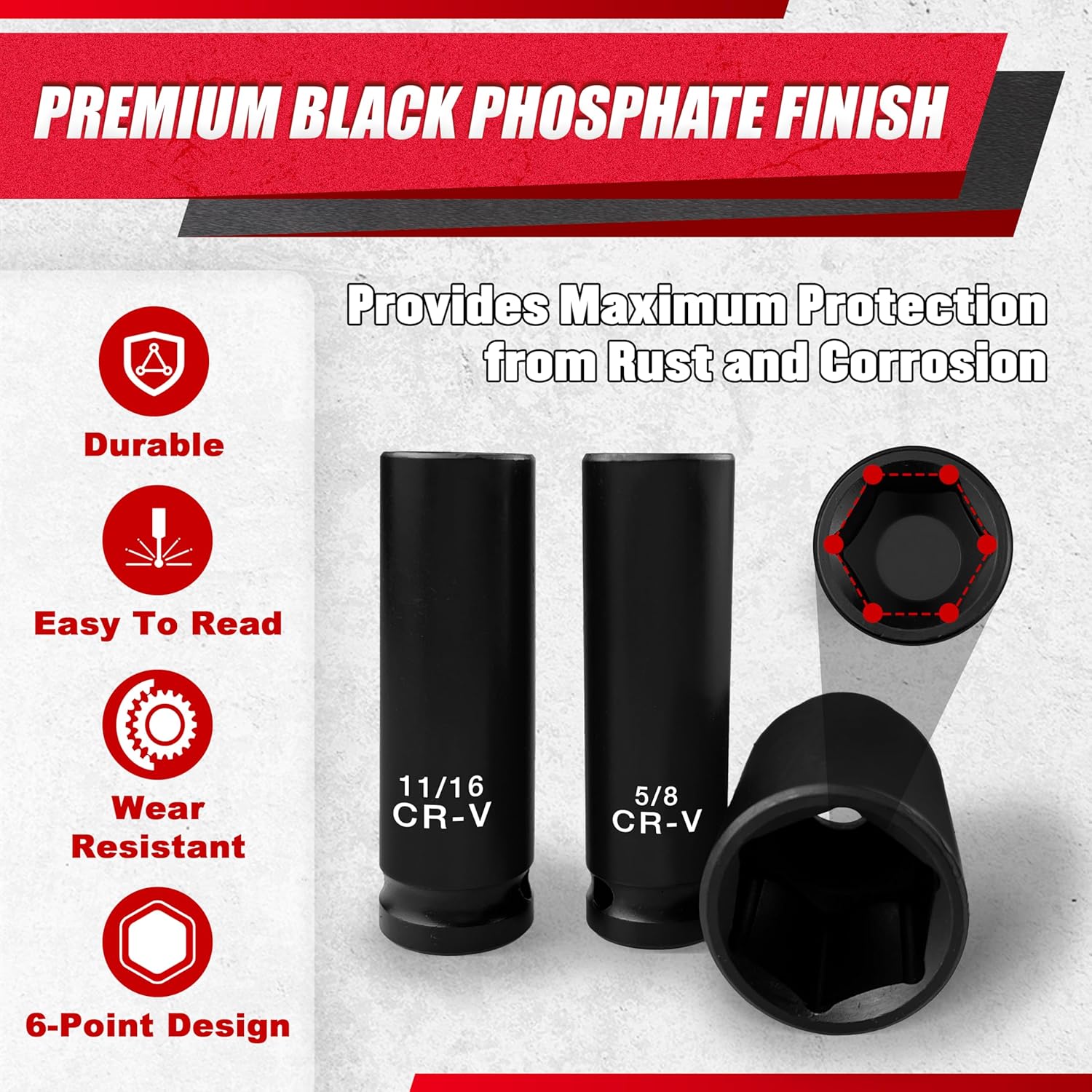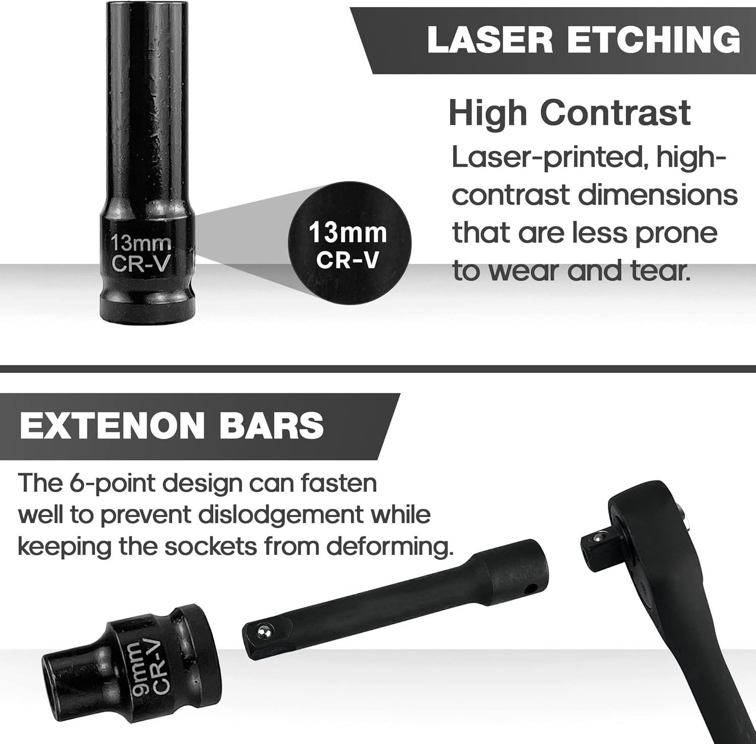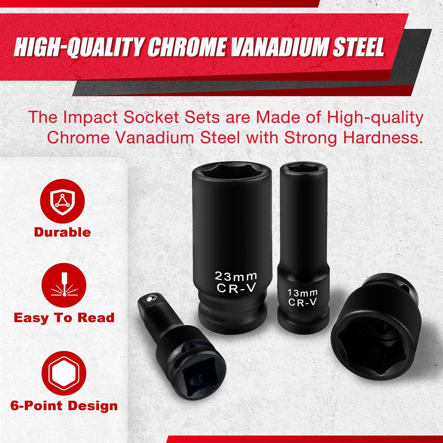 - 【Material】The impact socket sets are made of high-quality chrome vanadium steel with strong hardness. The heat treated CR-V steel has better toughness, and its surface is coated with a black powder coating of rust prevention and corrosion prevention,which is highly corrosion-resistant.