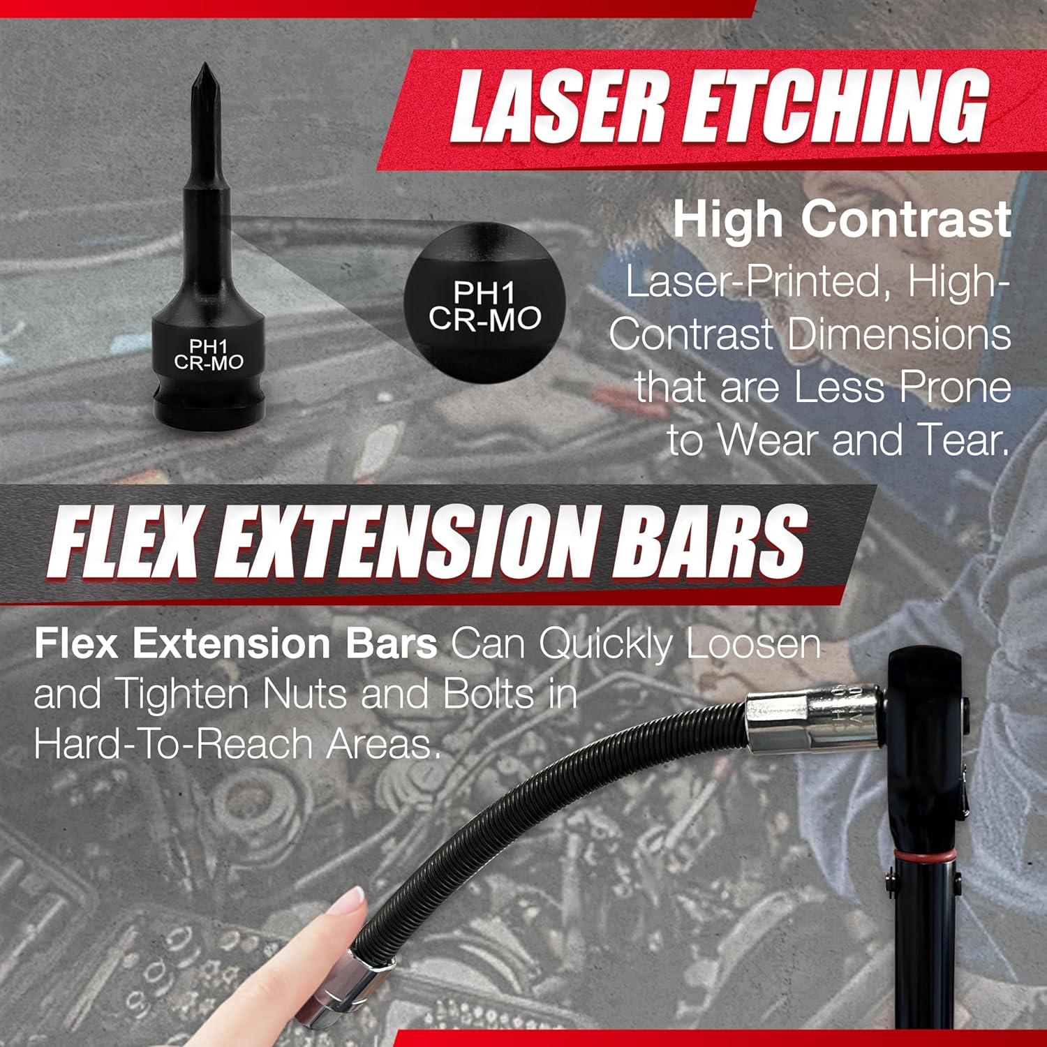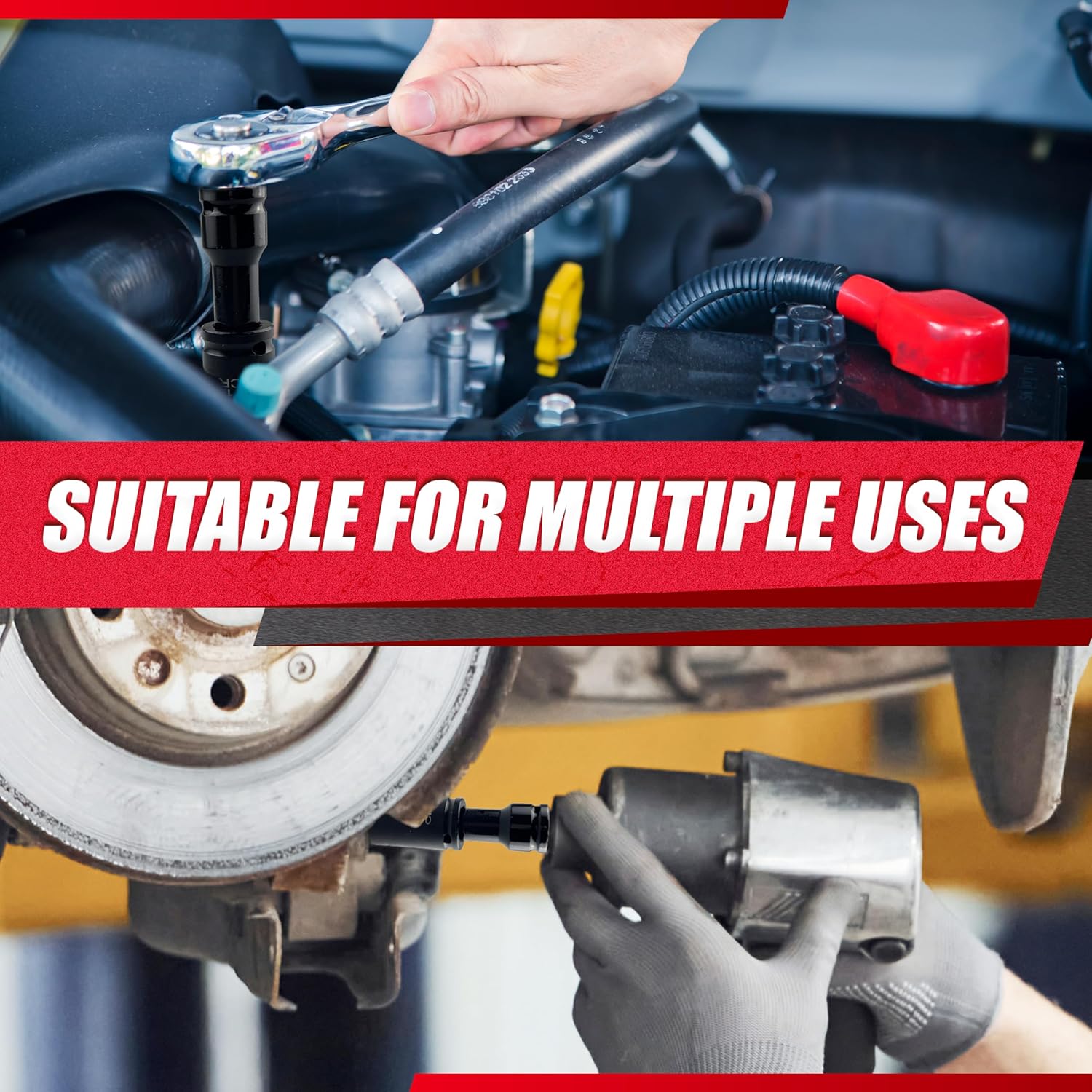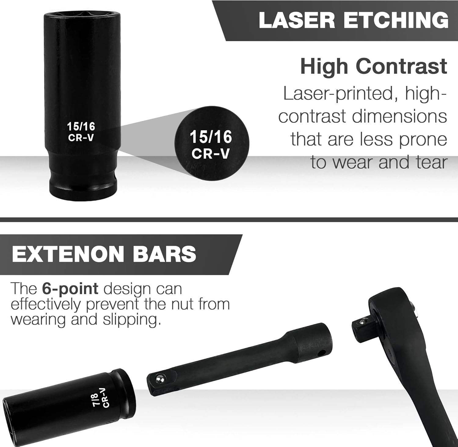 - 【Material】The impact socket sets are made of high-quality chrome vanadium steel with strong hardness. The heat treated CR-V steel has better toughness, and its surface is coated with a black powder coating of rust prevention and corrosion prevention,which is highly corrosion-resistant.